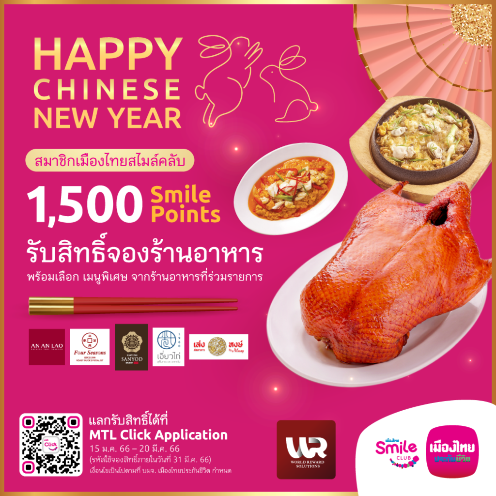 โดยสมาชิกฯ สามารถแลกคะแนนสะสม 1,500 Smile Points รับสิทธิ์จองร้านอาหาร พร้อมเลือก Set อาหารจากร้านอาหารที่ร่วมรายการ ณ ร้านเล่งหงษ์ ร้าน Four Seasons ร้าน เอี่ยวไถ่ 1960 ร้าน อัน อัน เหลา และร้านแสนยอด (1,500 คะแนน / 1 Set) โดยสมาชิกฯ แลกสิทธิ์ผ่านช่องทางแอปพลิเคชัน MTL Click และรับสิทธิ์ได้ตั้งแต่วันนี้ – 20 มีนาคม 2566 (รหัสใช้จองสิทธิ์และต้องเข้าใช้บริการที่ร้านอาหารภายในวันที่ 31 มีนาคม 2566)