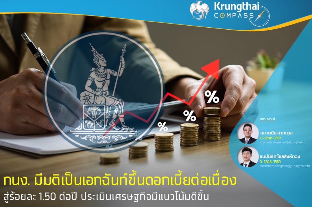 Krungthai COMPASS ประเมินว่า กนง. มีแนวโน้มปรับขึ้นอัตราดอกเบี้ยต่อเนื่องในการประชุมครั้งถัดไป โดยมีปัจจัยสนับสนุนจากเศรษฐกิจที่ฟื้นตัวดีและอัตราเงินเฟ้อที่คาดว่าจะอยู่สูง กว่ากรอบเป้าหมายโดยเฉพาะในช่วงครึ่งแรกของปีนี้ โดยเศรษฐกิจไทยมีแนวโน้มกลับเข้าสู่ระดับ Pre-COVID แล้ว และคาดว่าจะเติบโตได้ต่อเนื่องจากแรงขับเคลื่อนของภาคการท่องเที่ยวที่ฟื้นตัวดี