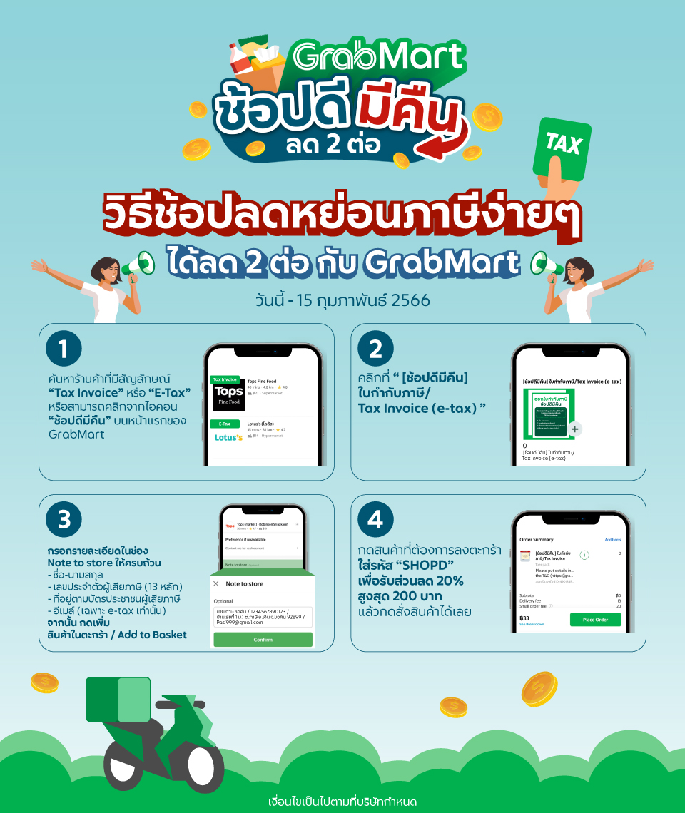 พร้อมมอบสิทธิพิเศษสำหรับผู้ที่เลือกช้อปผ่านแกร็บมาร์ทด้วยส่วนลดสูงสุด 200 บาท เมื่อซื้อสินค้าแกร็บมาร์ทขั้นต่ำ 600 บาท เพียงกรอกรหัส SHOPD” ผู้ใช้บริการสามารถสั่งซื้อสินค้าผ่านแกร็บมาร์ทและใช้สิทธิโครงการช้อปดีมีคืน 2566 ได้ตามขั้นตอนนี้