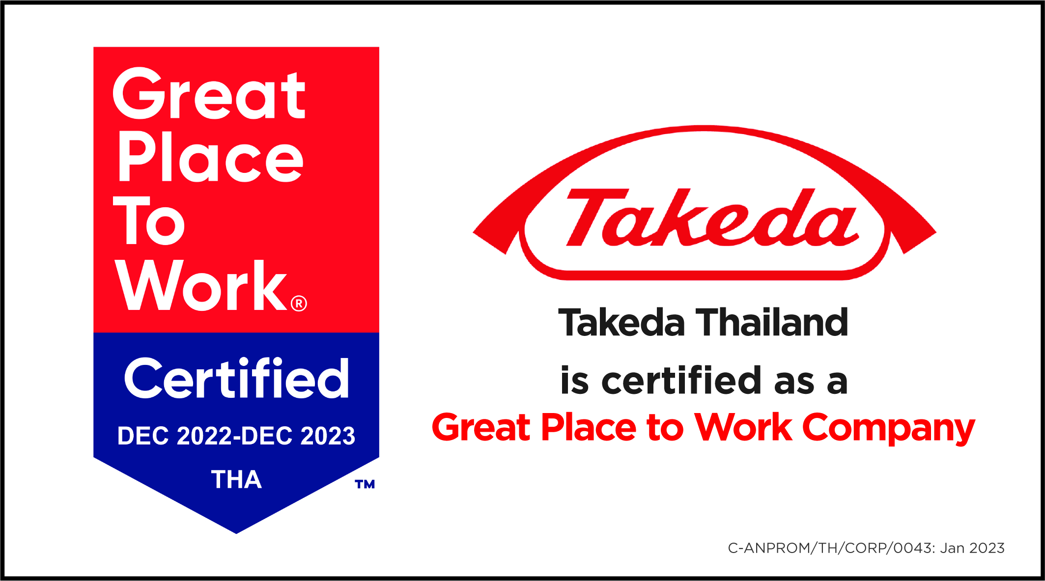 26 มกราคม 2566 : ทาเคดา ประเทศไทย บริษัทชีวเภสัชภัณฑ์ระดับโลกที่ขับเคลื่อนด้วยการวิจัยและพัฒนา ได้รับการรับรองสถานที่ทำงานที่ยอดเยี่ยมสำหรับปี 2565-2566 (ตั้งแต่เดือนธันวาคม 2565 – ธันวาคม 2566) จาก Great Place To Work® โดยการรับรองในครั้งนี้ เป็นการตอกย้ำถึงความมุ่งมั่นของบริษัทฯ ในการสร้างองค์กรที่ให้ความสำคัญกับความหลากหลายเท่าเทียมและการมีส่วนร่วม