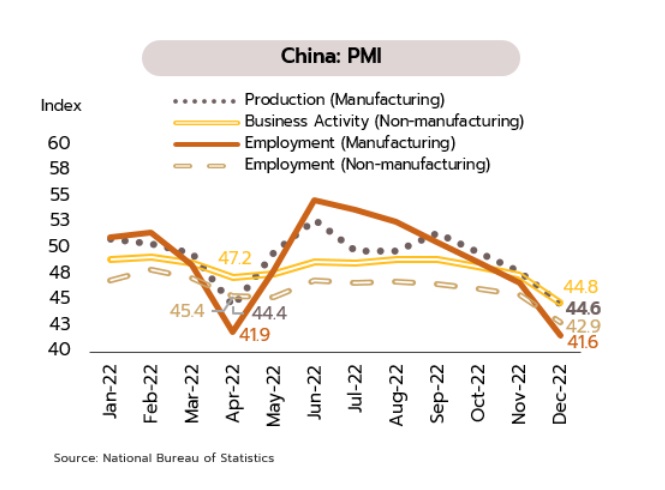 การผลิตสินค้าและบริการมีแนวโน้มผ่านจุดต่ำสุดในเดือนธันวาคม โดยคาดว่าจะกระเตื้องขึ้นใน Q1 และจะปรับตัวดีขึ้นชัดเจนใน Q2 จำนวนผู้ติดเชื้อที่เพิ่มสูงขึ้นภายหลังการยกเลิกมาตรการโควิดเป็นศูนย์เมื่อต้นเดือนธันวาคมที่ผ่านมา ทำให้การดำเนินธุรกิจในเดือนธันวาคมชะลอตัวลง โดย PMI ด้านการจ้างงานในภาคการผลิตและนอกภาคการผลิตในเดือนธันวาคมหดตัวลงไปอยู่ที่ 41.6 และ 42.9 ในขณะที่ PMI ด้านการผลิตสินค้าและบริการในภาคการผลิตและนอกภาคการผลิตลดลงไปที่ 44.6 และ 44.8