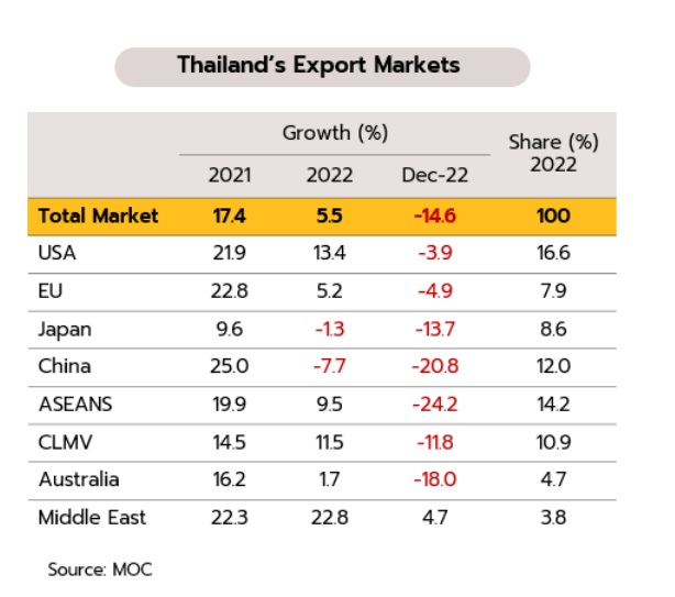 ด้านตลาดส่งออกพบว่าหดตัวในทุกตลาดหลัก นำโดยอาเซียน 5 (-24.2%) จีน (-20.8%) ญี่ปุ่น (-13.7%) สหภาพยุโรป (-4.9%) และสหรัฐ (-3.9%) สำหรับการส่งออกทั้งปี 2565 มีมูลค่ารวม 287.1 พันล้านดอลลาร์ ขยายตัว 5.5% เทียบกับปี 2564 ที่มูลค่า 272.0 พันล้านดอลลาร์ ขยายตัว 17.4% สัญญาณการส่งออกของไทยอ่อนแอลงตั้งแต่ช่วงไตรมาสสุดท้ายของปีก่อน จากการชะลอตัวของอุปสงค์ทั่วโลก