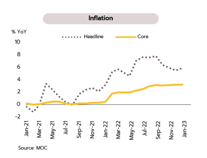 ขณะที่การส่งออกสินค้ามีแนวโน้มชะลอลงในปีนี้ แต่จะฟื้นตัวในปี 2567 ตามการขยายตัวของเศรษฐกิจโลกที่คาดว่าจะผ่านจุดต่ำสุดในปี 2566 ก่อนจะปรับดีขึ้นในปีหน้า ด้านอัตราเงินเฟ้อทั่วไปมีแนวโน้มลดลง โดยแรงกดดันเงินเฟ้อด้านอุปทานทยอยคลี่คลายตามราคาพลังงานและสินค้าโภคภัณฑ์ที่ปรับลดลงแต่อัตราเงินเฟ้อพื้นฐานยังทรงตัวในระดับสูงและมีความเสี่ยงเพิ่มขึ้นจากแรงกดดันเงินเฟ้อด้านอุปสงค์ตามการฟื้นตัวของเศรษฐกิจ