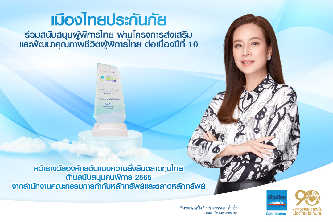 ปี 2565 เมืองไทยประกันภัย ได้รับรางวัลองค์กรต้นแบบความยั่งยืนตลาดทุนไทย ด้านสนับสนุนคนพิการ จากสำนักงานคณะกรรมการกำกับหลักทรัพย์และตลาดหลักทรัพย์ (ก.ล.ต.) เราให้ความสำคัญกับนโยบายความรับผิดชอบต่อสังคม เพื่อการพัฒนาองค์กรอย่างยั่งยืน และพร้อมเป็นส่วนหนึ่งของการสร้างโอกาสและความเสมอภาคในสังคมให้แก่ผู้พิการ เพื่อให้ได้มีคุณภาพชีวิตที่ดียิ่งขึ้น สามารถดำเนินอยู่ในสังคมไทยได้อย่างมีความสุข ... ยิ้มได้ เมื่อภัยมา ![]()