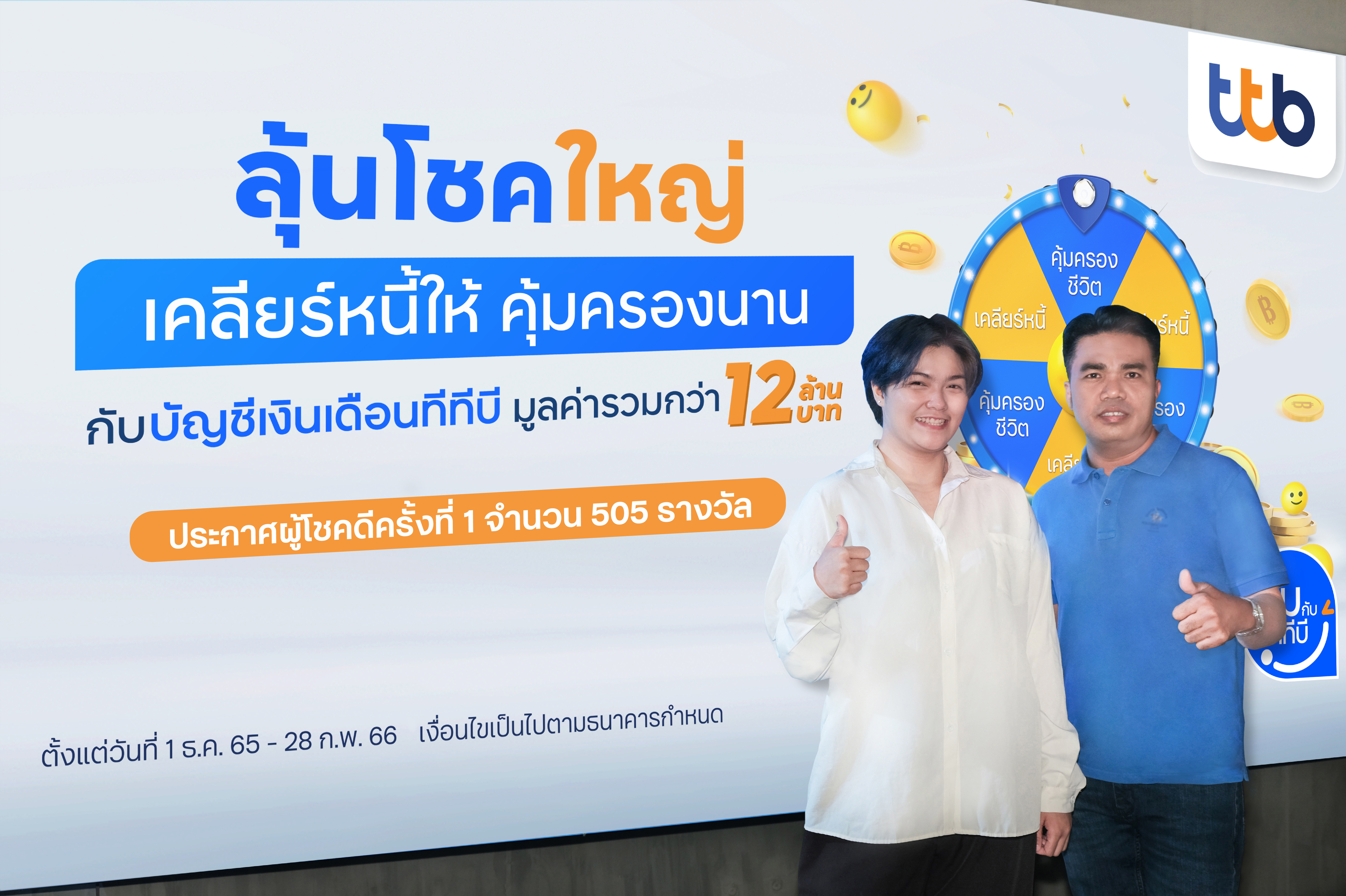 7 กุมภาพันธ์ 2566 : ทีเอ็มบีธนชาต หรือ ทีทีบี มอบรางวัลครั้งที่ 1 จากแคมเปญ “ลุ้นโชคใหญ่ เคลียร์หนี้ให้ คุ้มครองนาน” กับบัญชีเงินเดือนทีทีบี ที่ตอบโจทย์ความต้องการและตอกย้ำความคุ้มค่าที่ได้มากกว่าบัญชีเงินเดือนทั่วไป ด้วยการมอบอิสระในการเลือกรับรางวัลเคลียร์หนี้หรือกรมธรรม์ประกันชีวิต ซึ่งผู้โชคดี 2 ใน 5 ท่านที่ได้รับรางวัลที่ 1 ได้แก่