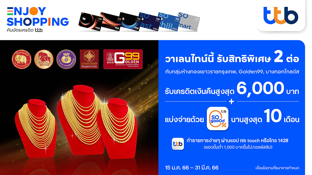 7 กุมภาพันธ์ 2566 : บัตรเครดิต ทีทีบี ร่วมกับ กลุ่มห้างทองเยาวราชกรุงเทพ (ห้างทองเยาวราชกรุงเทพ, ห้างทองเยาวราช, ห้างทองเยาวราชออมทอง) ห้างทอง Golden99 และห้างทองบางกอกโกลด์ส ร่วมฉลองวาเลนไทน์นี้ ด้วยสิทธิพิเศษ 2 ต่อ เมื่อซื้อทองด้วยบัตรเครดิต ทีทีบี ทุกประเภท ตั้งแต่วันนี้ ถึง 31 มีนาคม 2566 ดังนี้
