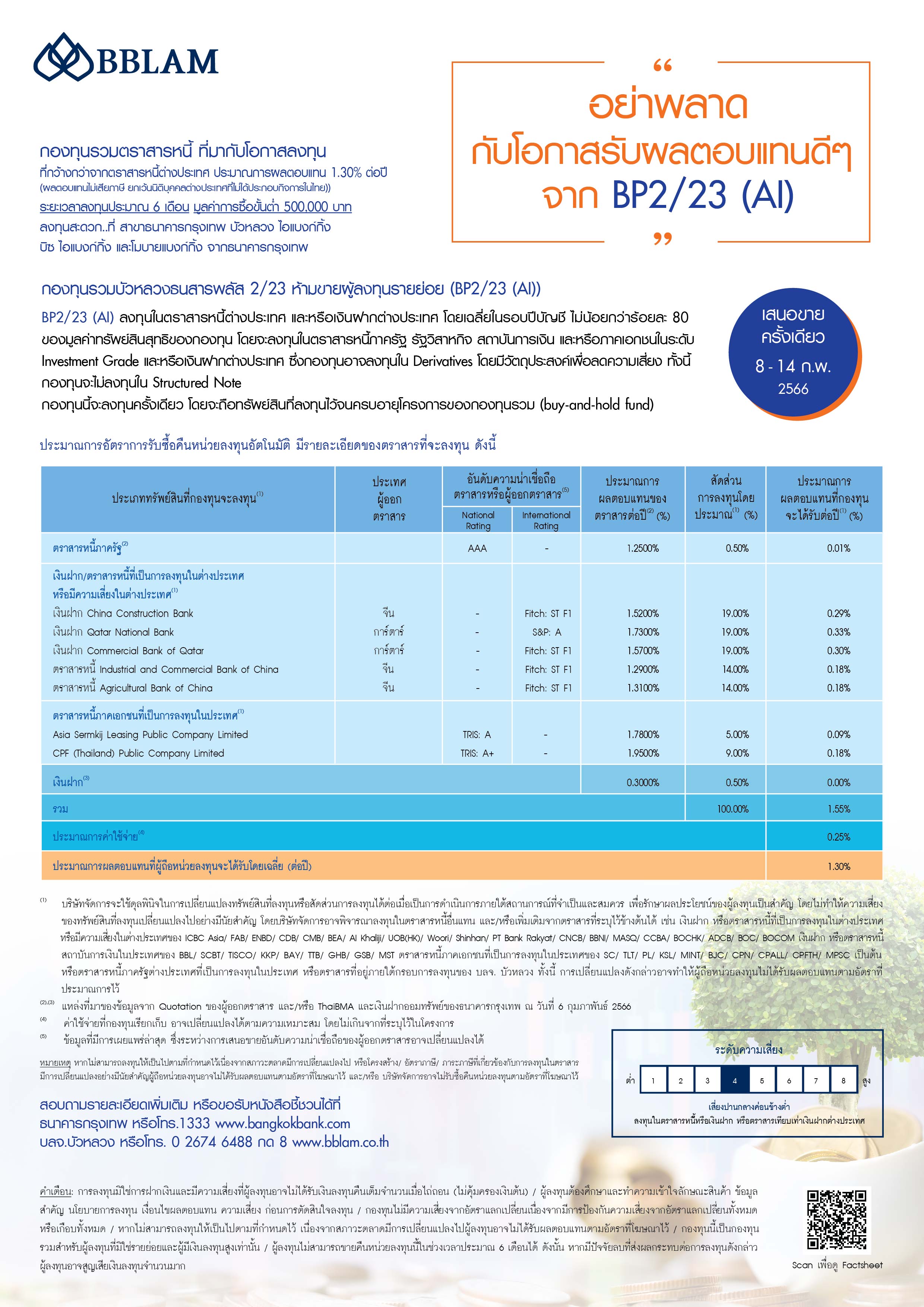 7 กุมภาพันธ์ 2566 : รายงานข่าวจาก บริษัทหลักทรัพย์จัดการกองทุนรวม บัวหลวง จำกัด หรือ BBLAM เปิดเผยว่า BBLAM เสนอขายหน่วยลงทุนครั้งแรก (IPO) กองทุนรวมบัวหลวงธนสารพลัส 2/23 ห้ามขายผู้ลงทุนรายย่อย หรือ BP2/23 (AI) ระหว่างวันที่ 8-14 กุมภาพันธ์ 2566 นี้ ประมาณการผลตอบแทน 1.30% ต่อปี โดยเสนอขายในราคา 10 บาทต่อหน่วย และผู้ลงทุนจะต้องจองซื้อครั้งแรกขั้นต่ำ 500,000 บาท