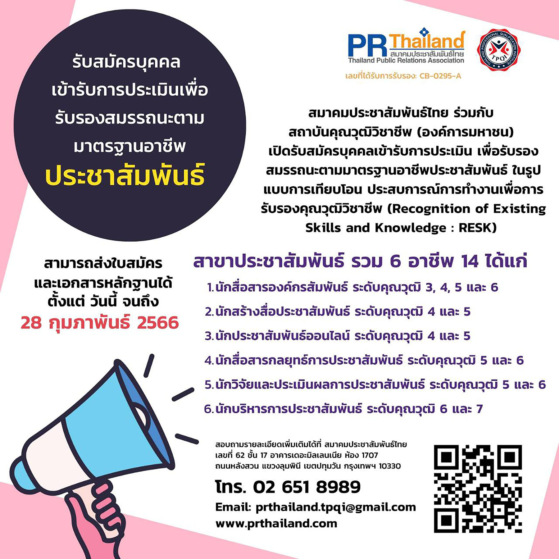 13 กุมภาพันธ์ 2566 : ผู้ช่วยศาสตราจารย์ ดร. พจน์ ใจชาญสุขกิจ นายกสมาคมประชาสัมพันธ์ไทย ได้กล่าวว่า สมาคมประชาสัมพันธ์ไทย ได้เปิดรับสมัครบุคคลเข้ารับการประเมินเพื่อรับรองสมรรถนะตามมาตรฐานอาชีพประชาสัมพันธ์ ในรูปแบบ การเทียบโอนประสบการณ์การทำงานเพื่อการรับรองคุณวุฒิวิชาชีพ (Recognition of Existing Skills and Knowledge: RESK) เพื่อเป็นการสร้างให้เกิดความเข้มแข็งตามมาตรฐานคุณวุฒิวิชาชีพ โดย สถาบันคุณวุฒิวิชาชีพ (องค์การมหาชน) ได้ใช้การอ้างอิงตาม ISO/IEC 17024 ในการรับรอง “สมรรถนะของบุคคล” อันเป็นมาตรฐานที่ได้มีการยอมรับในระดับสากล ในคราวนี้ ได้เปิดประเมินสาขาอาชีพประชาสัมพันธ์ รวม 6 อาชีพ 14 ระดับคุณวุฒิ ได้แก่