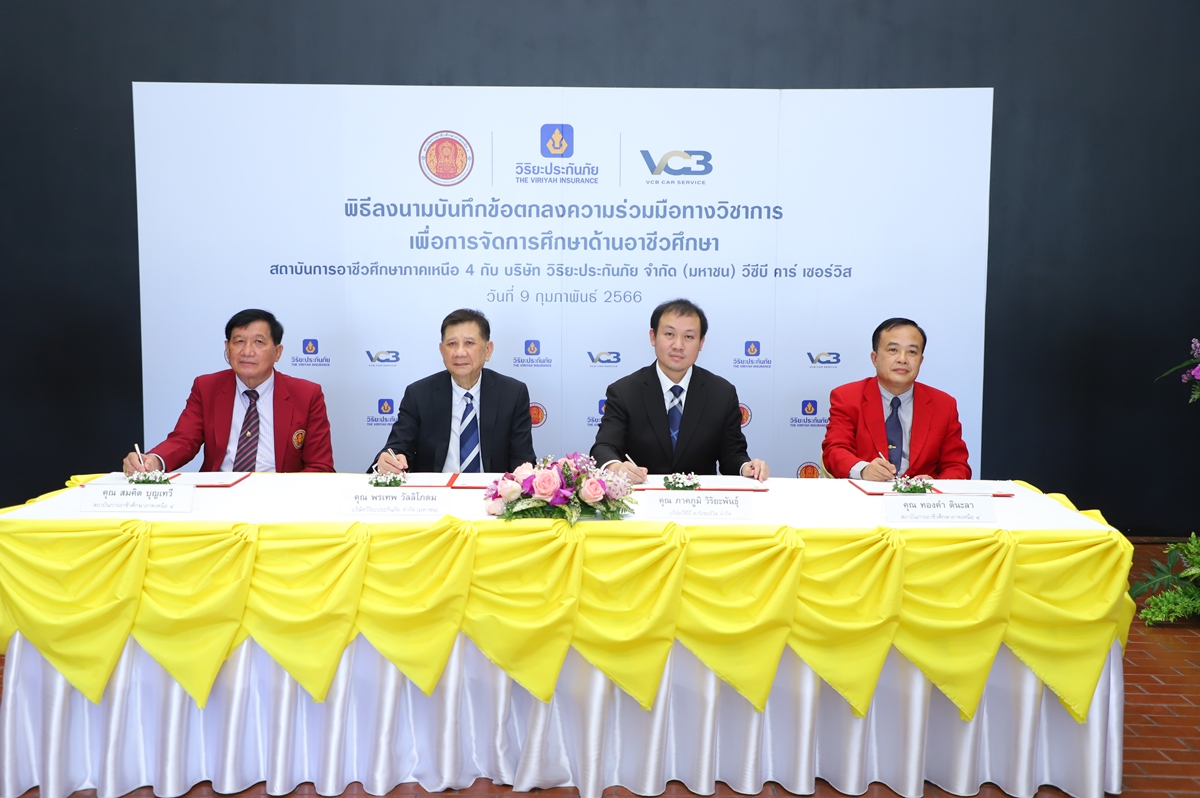 15 กุมภาพันธ์ 2566 : พรเทพ วัลลิโภดม รองกรรมการผู้จัดการ บริษัท วิริยะประกันภัย จำกัด (มหาชน) ภาคภูมิ วิริยะพันธุ์ ในฐานะรองกรรมการจัดการ บริษัท วีซีบีคาร์เซอร์วิส จำกัด สมคิด บุญเทวี ผู้อำนวยการสถาบันการอาชีวศึกษาภาคเหนือ 4 และ ทองคำ ตินะลา ผู้ช่วยผู้อำนวยการสถาบันการอาชีวศึกษาภาคเหนือ 4 ร่วมลงนามบันทึกข้อตกลงความร่วมมือทางวิชาการเพื่อการจัดการศึกษาด้านอาชีวศึกษากับสถาบันการอาชีวศึกษาภาคเหนือ 4 เพื่อสร้างบุคลากรคุณภาพ มีความรู้ความสามารถทางด้านเทคโนโลยี ผ่านหลักสูตรการเรียนรู้ มีทักษะและความชำนาญจากประสบการณ์จริง สามารถนำสิ่งที่ได้เรียนรู้ไปต่อยอดองค์ความรู้ และพัฒนาตนเองในการประกอบอาชีพ พร้อมก้าวสู่อุตสาหกรรมประกันภัยและตลาดแรงงานสากลได้อย่างภาคภูมิ