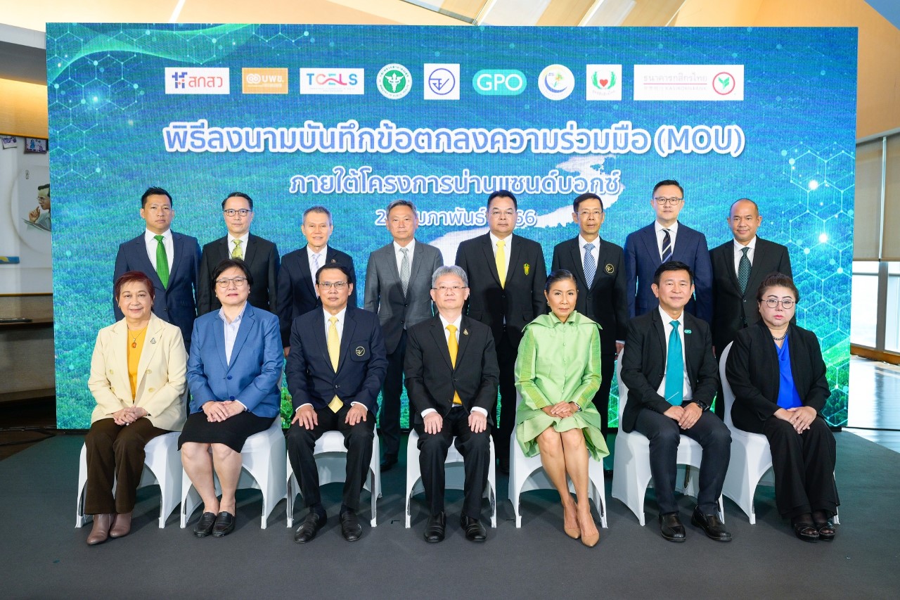 21 กุมภาพันธ์ 2566 : กอบกาญจน์ วัฒนวรางกูร ประธานกรรมการมูลนิธิกสิกรไทย (แถวหน้า ที่ 5 จากขวา) พร้อมด้วย นพ.ไพศาล ดั่นคุ้ม (แถวหน้า ที่ 3 จากซ้าย) เลขาธิการคณะกรรมการอาหารและยา นพ.วิฑูรย์ ด่านวิบูลย์ (แถวหน้า ที่ 6 จากขวา) ผู้อำนวยการองค์การเภสัชกรรม รศ.ดร.สิรี ชัยเสรี (แถวหน้า ที่ 2 จากซ้าย) ผู้อำนวยการหน่วยบริหารและจัดการทุนด้านการเพิ่มความสามารถในการแข่งขันของประเทศ สุวรรณา เตียรถ์สุวรรณ (แถวหน้าซ้าย) ผู้อำนวยการสำนักงานพัฒนาเศรษฐกิจจากฐานชีวภาพ และ ดร. จิตติ์พร ธรรมจินดา (แถวหน้าขวา) ผู้อำนวยการศูนย์ความเป็นเลิศด้านชีววิทยาศาสตร์ ร่วมลงนามบันทึกความร่วมมือภายใต้โครงการน่านแซนด์บอกซ์
