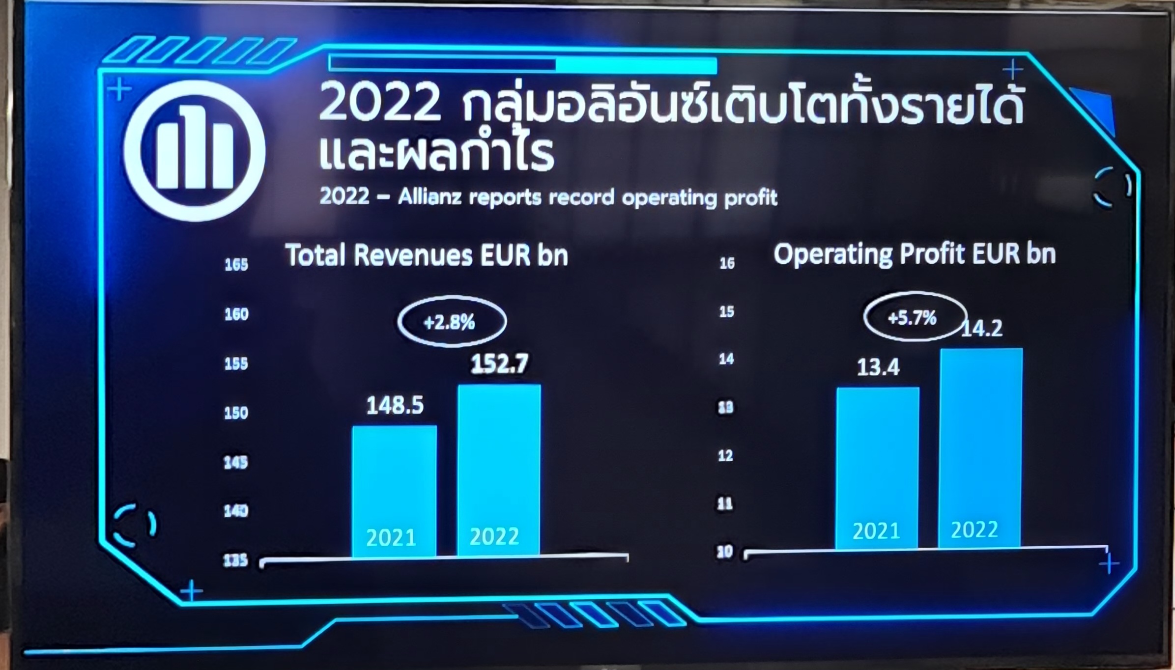 ขณะเดียวกัน กลุ่มอลิอันซ์ บริษัทผู้ถือหุ้นหลักของ บมจ. อลิอันซ์ อยุธยา ประกันชีวิต ได้รายงานผลประกอบการประจำปี 2565 บริษัทสร้างผลงานได้ดีมาก ทั้งรายได้และกำไรจากการดำเนินงานที่สูงเป็นประวัติการณ์ โดยมีรายได้เพิ่มขึ้น 2.8% อยู่ที่ 1.527 แสนล้านยูโร (ประมาณ 5.27 ล้านล้านบาท) กำไรจากการดำเนินงานพุ่ง 5.7% อยู่ที่ 1.42 หมื่นล้านยูโร (หรือประมาณ 4.9 แสนล้านบาท) จากผลประกอบการที่ดีเยี่ยมของประกันภัยทรัพย์สินและเบ็ดเตล็ด (Property-Casualty) และประกันชีวิต/สุขภาพ ในขณะที่อัตราส่วนเงินทุนเพื่อความมั่นคง (Solvency II capitalization) อยู่ที่ 201 เปอร์เซ็นต์ ณ สิ้นไตรมาสที่ 4 ของปี 2565