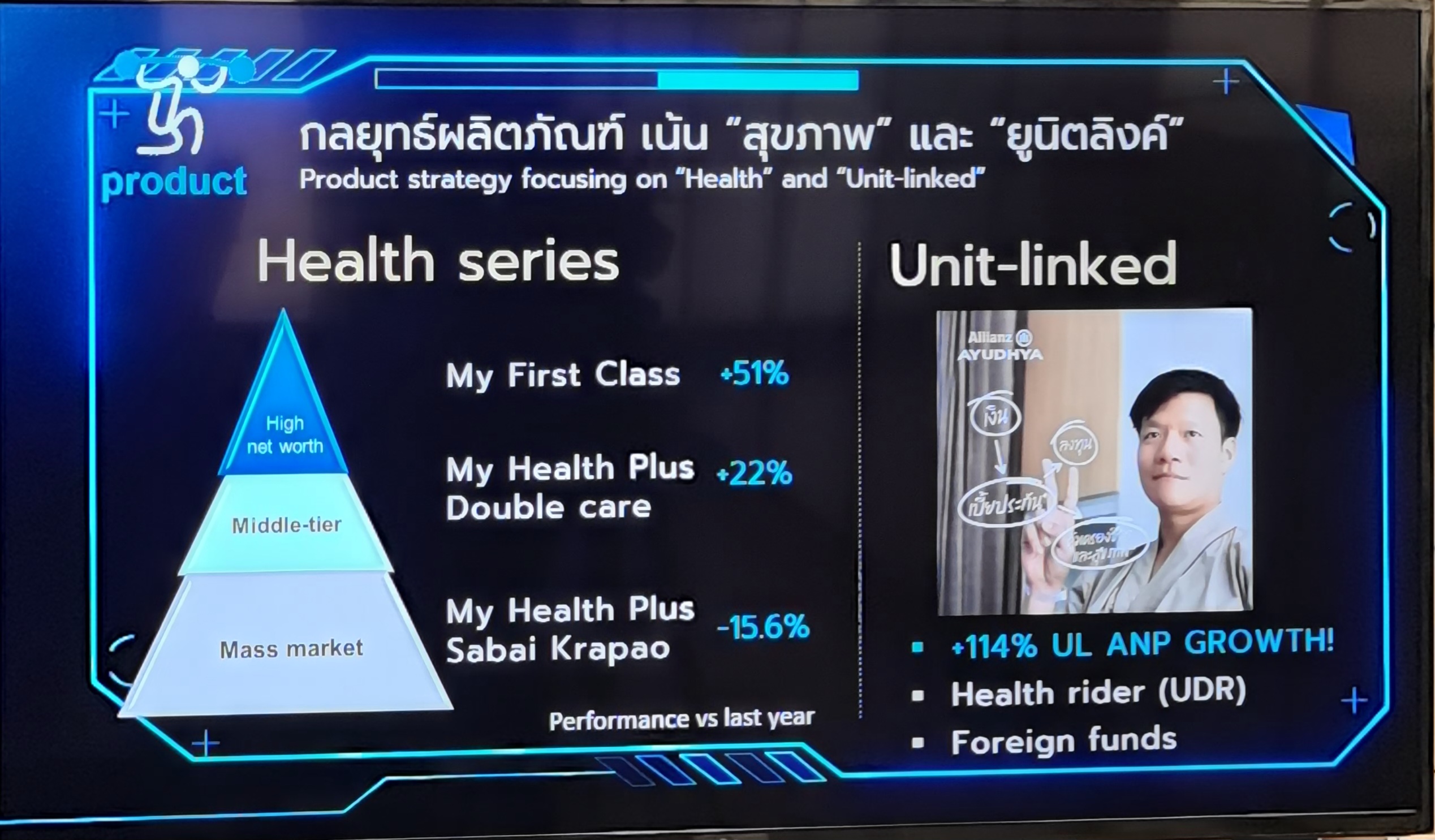 เสาที่ 2 Product Leadership – มุ่งเน้นพัฒนาผลิตภัณฑ์ที่ตอบโจทย์ และครอบคลุมทุกความต้องการคุ้มครองสุขภาพของลูกค้าทุกกลุ่ม อีกทั้งวางแผนเติบโตพอร์ทประกันควบการลงทุน (Unit-linked) อย่างต่อเนื่อง ซึ่งในปีที่ผ่านมา มีการเปิดตัวสัญญาเพิ่มเติมสุขภาพ UDR เพื่อใช้แนบกับประกันควบการลงทุนโดยเฉพาะ รวมทั้งเปิดตัวกองทุนต่างประเทศ และในปีนี้บริษัทฯยังจะมีการออกผลิตภัณฑ์ใหม่ๆ ในกลุ่มนี้เพิ่มขึ้น