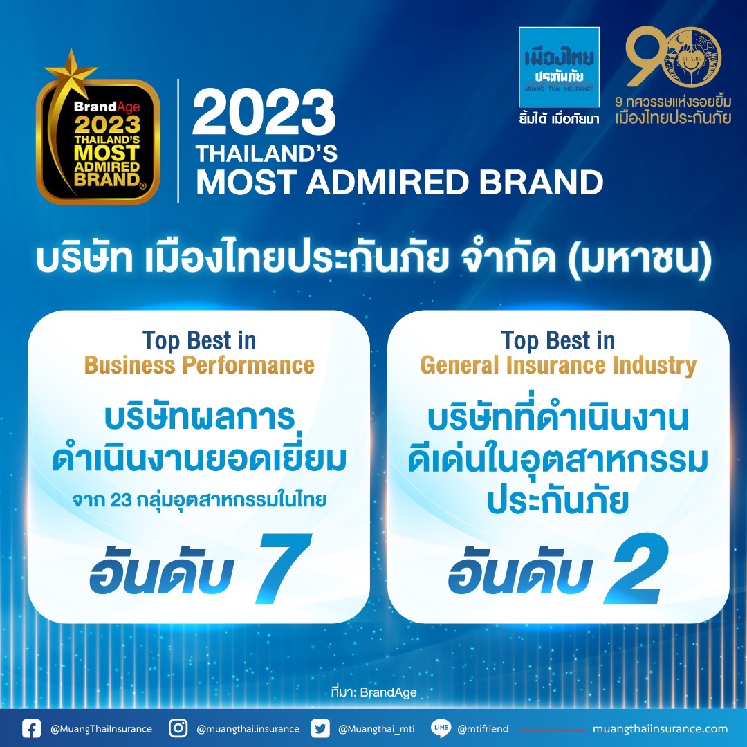 28 มีนาคม 2566 : บมจ.เมืองไทยประกันภัย คว้า 2 รางวัล แบรนด์ที่ครองใจผู้บริโภคแห่งปี “2023 Thailand’s Most Admired Brand” ได้แก่