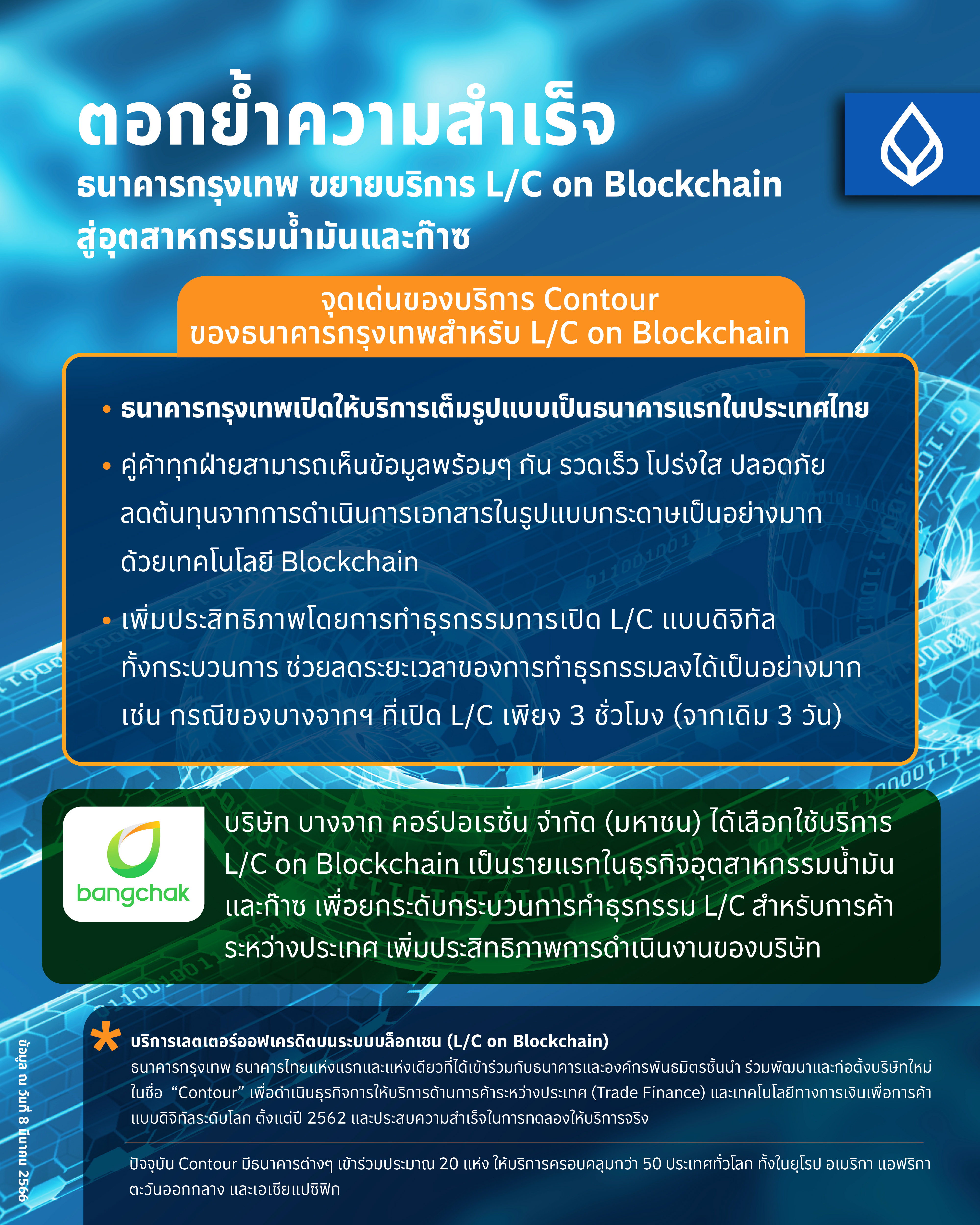 การร่วมกับธนาคารกรุงเทพในการนำเทคโนโลยีบล็อกเชนมาใช้ในธุรกรรมเลตเตอร์ออฟเครดิต (Letter of Credit: L/C) แบบอิเล็กทรอนิกส์ผ่านบริษัท Contour ซึ่งเป็นผู้ให้บริการแพล็ตฟอร์มชั้นแนวหน้าที่มีมาตรฐานความปลอดภัยระดับสากลครั้งนี้ นับเป็นอีกก้าวหนึ่งในการนำขับเคลื่อนการทำธุรกรรมการค้าระหว่างประเทศของบางจากฯ ให้ดีขึ้นอย่างชัดเจน บริษัทที่เป็นคู่ค้าในการทำธุรกรรมการค้าระหว่างประเทศสามารถตรวจสอบรายละเอียดของธุรกรรมได้ชัดเจน มีความโปร่งใส