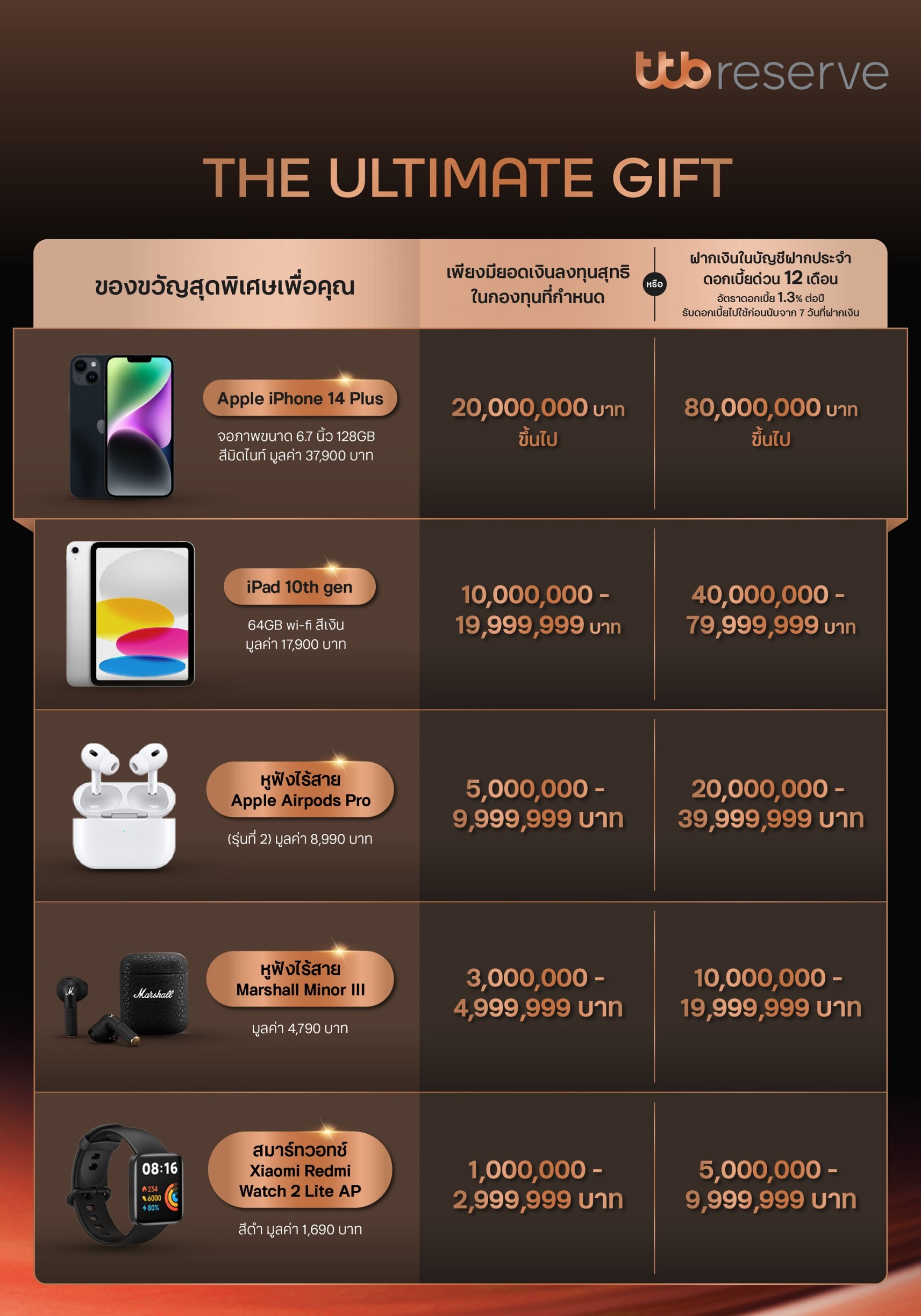 ทั้งนี้ ธนาคารได้คัดกองทุนเด่นมาให้ลูกค้าได้เลือกพอร์ตลงทุน สำหรับลูกค้าที่ลงทุนในกองทุนที่กำหนด พร้อมรับของขวัญพิเศษ เมื่อมียอดเงินลงทุนสุทธิ 1,000,000 – 2,999,999 บาท รับสมาร์ทวอทช์ Xiaomi Redmi Watch 2 Lite AP ยอดเงินลงทุนสุทธิ 3,000,000 – 4,999,999 บาท รับหูฟังไร้สาย Marshall Minor III ยอดเงินลงทุนสุทธิ 5,000,000 – 9,999,999 บาท รับหูฟังไร้สาย Apple Airpods Pro (รุ่นที่ 2) ยอดเงินลงทุนสุทธิ 10,000,000 – 19,999,999 บาท รับ Apple iPad รุ่นที่ 10 ความจุ 64 GB Wi Fi ยอดเงินลงทุนสุทธิ 20,000,000 บาทขึ้นไป ได้รับ Apple iPhone 14 Plus จอภาพขนาด 6.7 นิ้ว ความจุ 128 GB