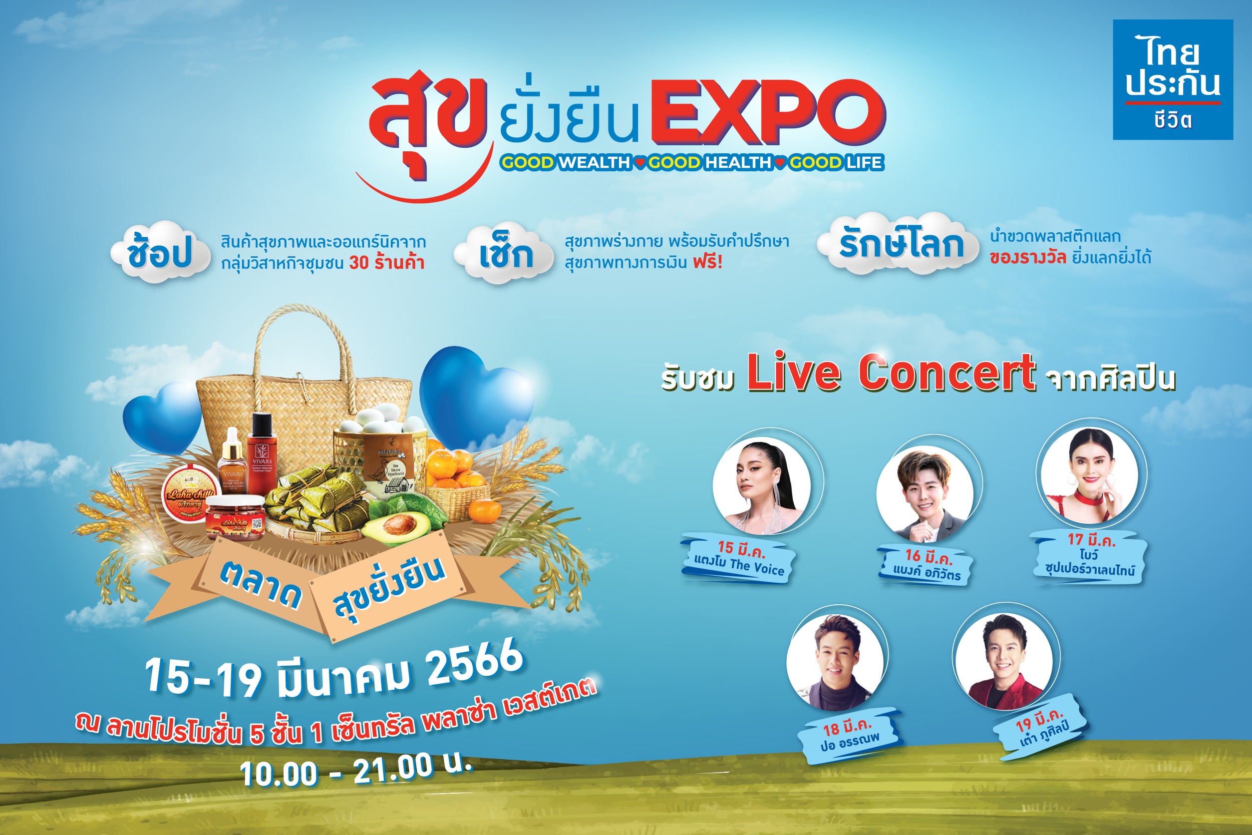 15 มีนาคม 2566 : ไทยประกันชีวิตจัดงาน “สุขยั่งยืน EXPO” ตอบโจทย์คนรักสุขภาพ รวบรวมผลิตภัณฑ์และสินค้าเกษตรเพื่อสุขภาพจากกลุ่มวิสาหกิจชุมชนและกลุ่มตลาดสุขยั่งยืน เช็กสุขภาพวิเคราะห์ความสมดุลของร่างกายด้วยเทคโนโลยีใหม่ล่าสุด พร้อมบริการให้คำปรึกษาแนวทางการดูแลสุขภาพกายและสุขภาพทางการเงิน ตลอดจนกิจกรรมให้ร่วมสนุกอีกมากมาย ระหว่างวันที่ 15-19 มีนาคม 2566 เวลา 10.00 – 21.00 น. ณ ลานโปรโมชัน 5 ชั้น 1 เซ็นทรัล เวสต์เกต