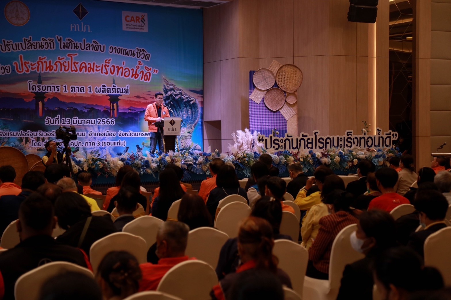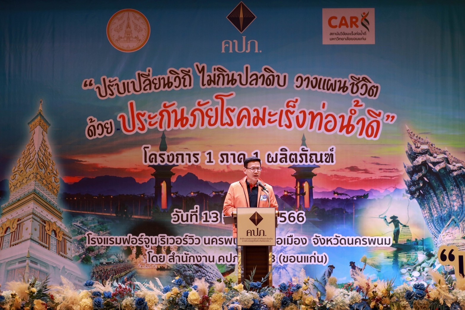 จังหวัดนครพนม 16 มีนาคม 2566 : ดร. สุทธิพล ทวีชัยการ เลขาธิการคณะกรรมการกำกับและส่งเสริมการประกอบธุรกิจประกันภัย (เลขาธิการ คปภ.) เป็นประธานเปิดเวทีเสวนาตามโครงการ 1 ภาค 1 ผลิตภัณฑ์ ในหัวข้อ “ปรับเปลี่ยนวิถี ไม่กินปลาดิบ วางแผนชีวิตด้วยประกันภัยโรคมะเร็งท่อน้ำดี” โดยมีนายวันชัย จันทร์พร ผู้ว่าราชการจังหวัดนครพนม ให้เกียรติกล่าวต้อนรับ พร้อมด้วยวิทยากรผู้ทรงคุณวุฒิจากหน่วยงานเครือข่ายที่ให้ความรู้ ประกอบด้วย ผู้ช่วยศาสตราจารย์ นายแพทย์อรรถพล ติตะปัญ หัวหน้าศูนย์ความเป็นเลิศมะเร็งท่อน้ำดี โรงพยาบาลศรีนครินทร์ และกรรมการสถาบันวิจัยมะเร็งท่อน้ำดี (CARI)