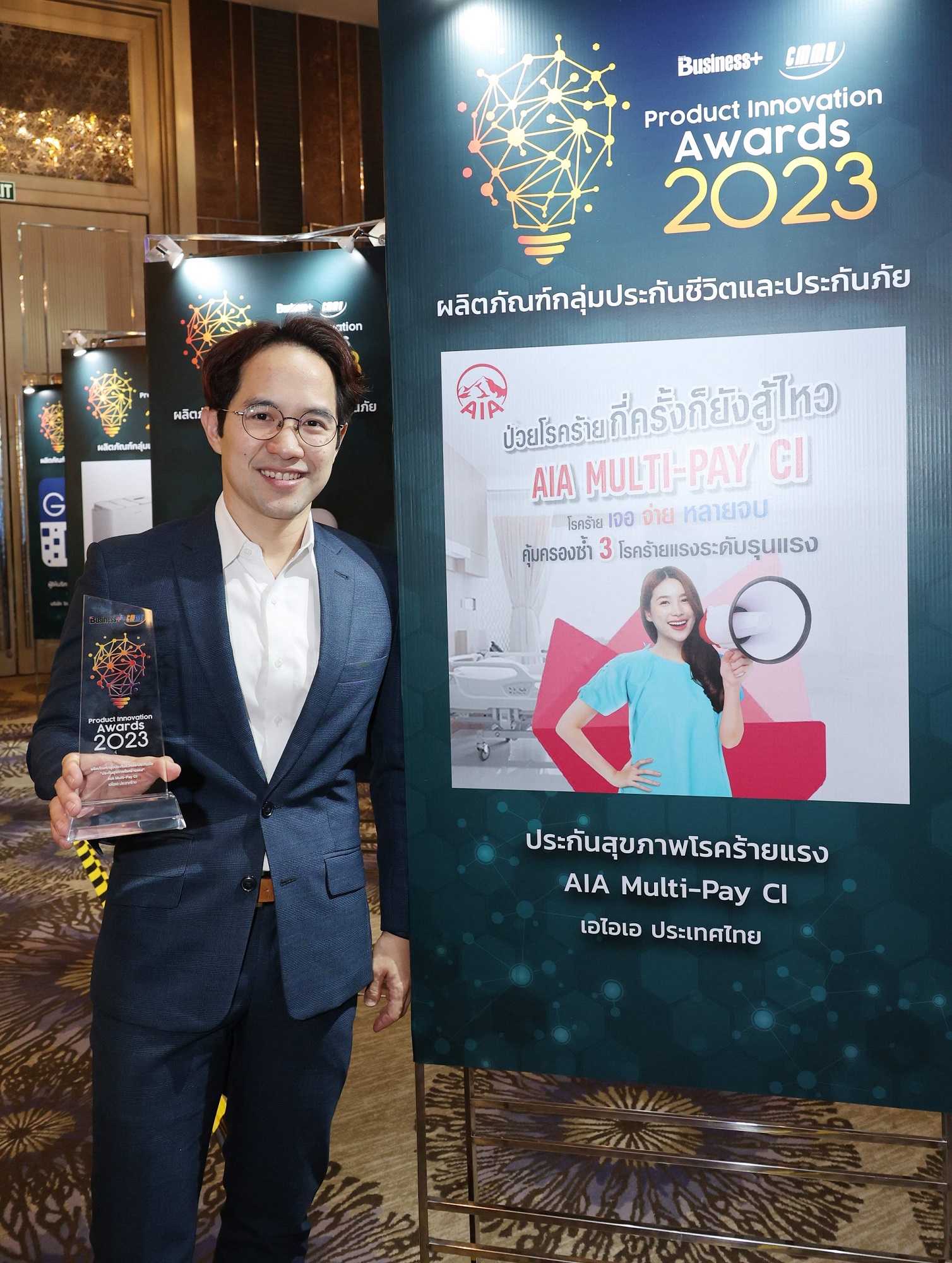 กรุงเทพฯ, 17 มีนาคม 2566 : เอไอเอ ประเทศไทย โดย เอกรัตน์ ฐิติมั่น ประธานเจ้าหน้าที่ฝ่ายการตลาด รับรางวัลอันทรงเกียรติ Business+ Product Innovation Awards 2023 ในสาขาผลิตภัณฑ์กลุ่มประกันชีวิตและประกันภัย จากความสำเร็จและนวัตกรรมที่ตอบโจทย์ผู้บริโภคอย่างยอดเยี่ยมของ “ผลิตภัณฑ์ประกันโรคร้ายแรง AIA Multi-Pay CI” จัดโดยนิตยสาร Business+ ร่วมกับวิทยาลัยการจัดการมหาวิทยาลัยมหิดล ซึ่งมอบให้แก่สุดยอดสินค้าและบริการที่มีนวัตกรรมแห่งปี 2566 โดย AIA Multi-Pay CI นับเป็นปรากฏการณ์ใหม่แห่งวงการประกันโรคร้ายแรง