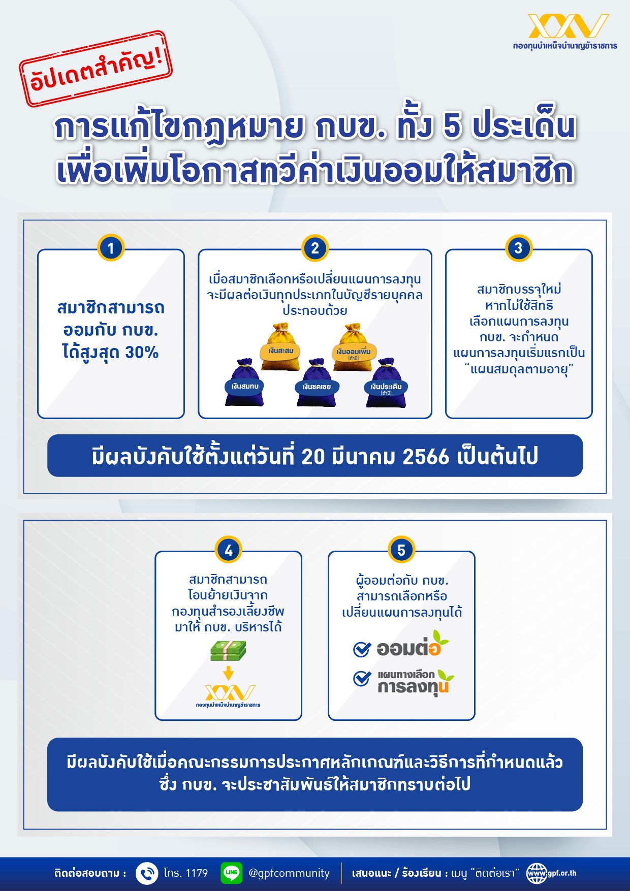 1. สมาชิก กบข. สามารถออมเพิ่มได้สูงสุด 27% ของเงินเดือน เมื่อรวมกับเงินสะสม 3% จะสามารถออมกับ กบข. ได้สูงสุดถึง 30% จากเดิม ที่ออมเพิ่มได้สูงสุดเพียง 12% เท่านั้น