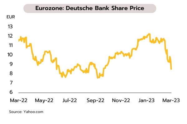 โดย DB นับเป็นธนาคารที่มีขนาดใหญ่ที่สุดของเยอรมนีและถูกจัดอันดับอยู่ในกลุ่มสถาบันการเงินที่มีความสำคัญเชิงระบบ (Systemically Important Financial Institution: SIFI) ดังนั้น จึงมีความเสี่ยงที่ผลกระทบอาจลุกลามในวงกว้าง แม้ชุดข้อมูลล่าสุดบ่งชี้ว่า DB เป็นธนาคารที่มีผลกำไรและสภาพคล่องสูงเพียงพอที่จะไม่กลายเป็นโดมิโนต่อจาก Credit Suisse ขณะที่ความเสี่ยงที่จะเกิดวิกฤตทางการเงินในยุโรปยังอยู่ในระดับที่ค่อนข้างต่ำจากการสนับสนุนของธนาคารกลางที่เข้ามาช่วยฟื้นฟูความเชื่อมั่น รวมถึงบรรเทาความเสี่ยงเรื่อง contagion ลงได้ในระยะสั้น