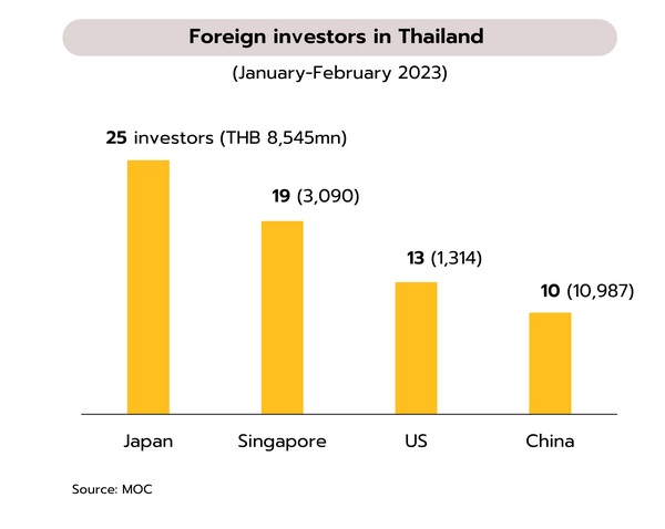 การลงทุนจากต่างประเทศทยอยมีสัญญาณเชิงบวกมากขึ้น สะท้อนจากมูลค่าเงินลงทุนที่เข้ามาในช่วง 2 เดือนแรกของปีนี้สูงกว่า 3เท่าจากช่วงเดียวกันปีก่อน และเฉพาะเดือนกุมภาพันธ์เดือนเดียวนั้นมีมูลค่าเงินลงทุนอยู่ที่ 21,267 ล้านบาท เทียบกับ 5,129 ล้านบาท ในเดือนมกราคม ส่วนหนึ่งอาจได้อานิสงส์จากการเปิดประเทศของจีน ทำให้มีมูลค่าการลงทุนจากจีนเพิ่มสูงมากที่ 10,439 ล้านบาท จาก 548 ล้านบาทในเดือนมกราคม