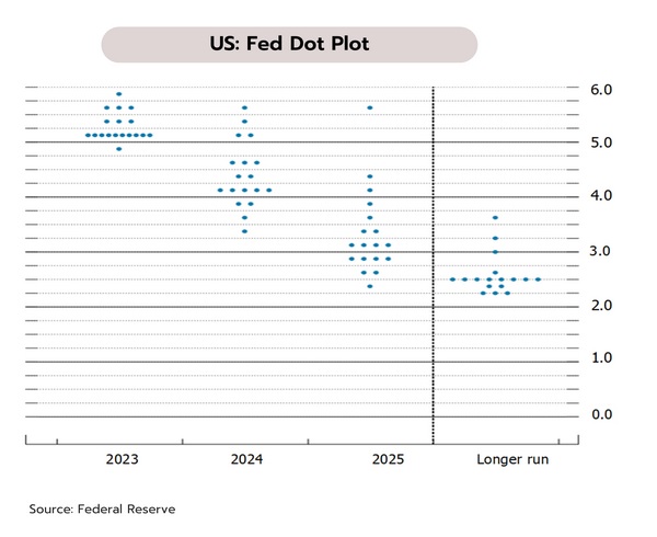 28 มีนาคม 2566 : ธนาคารกลางสหรัฐ (เฟด) ปรับขึ้นอัตราดอกเบี้ย 0.25% สู่ระดับ 4.75-5.00% ในการประชุมเดือนมีนาคม ท่ามกลางความเสี่ยงต่อเสถียรภาพทางการเงินที่เพิ่มขึ้น อย่างไรก็ตาม คณะกรรมการเฟดแสดงความกังวลถึงปัญหาของกลุ่มธนาคารไม่มากนัก ขณะที่การคาดการณ์อัตราดอกเบี้ยนโยบายของเจ้าหน้าที่เฟด (Dot Plot) บ่งชี้ว่าวงจรการปรับขึ้นดอกเบี้ยอาจใกล้สิ้นสุดที่ระดับ 5.10% ในปีนี้ (ขึ้นอีกเพียง 1 ครั้งในปีนี้) ก่อนปรับลดลงสู่ 4.30% ในปี 2567 และ 3.10% ในปี 2568