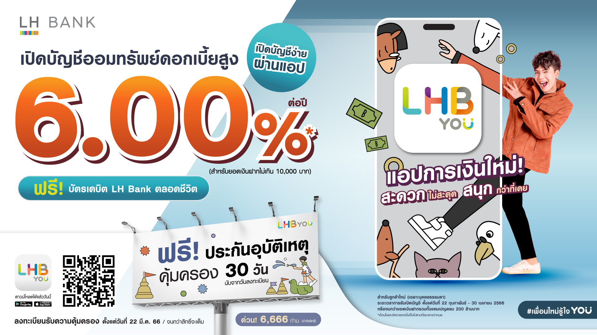 ต้อนรับเทศกาลสงกรานต์ LH Bank ขอมอบสิทธิพิเศษให้ลูกค้าที่มีแอปพลิเคชัน LHB You รับฟรีประกันอุบัติเหตุให้ความคุ้มครองชีวิตสูงสุด 100,000 บาท (กรณีเสียชีวิตจากอุบัติเหตุ) รวมถึงการขับขี่และโดยสารรถจักรยานยนต์ ระยะความคุ้มครองนาน 30 วัน พร้อมค่าชดเชยรายวันสูงสุด 2,000 บาท (วันละ 500 บาท สูงสุด 4 วัน) และค่าจัดงานศพจากอุบัติเหตุ สูงสุด 10,000 บาท เฉพาะลูกค้าที่ลงทะเบียนรับสิทธิ์ผ่านแอปพลิเคชัน LHB You 1 ท่าน ต่อ 1 สิทธิ์