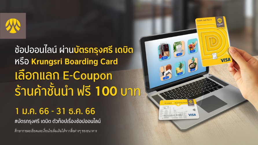 10 เมษายน 2566 : กรุงศรี (ธนาคารกรุงศรีอยุธยา จำกัด (มหาชน)) ส่งแคมเปญพิเศษเอาใจขาช้อปออนไลน์ เมื่อใช้จ่ายออนไลน์ที่ใดก็ได้ด้วยบัตรกรุงศรี เดบิต หรือ Krungsri Boarding Card ครบ 1,000 บาท (ภายใต้บัตรหมายเลขเดียวกัน ณ วันที่ทำรายการแลกรางวัล) ตั้งแต่วันที่ 1 มกราคม 2566 – 31 ธันวาคม 2566 แลกรับ E-Coupon มูลค่า 100 บาท จากร้านค้าชั้นนำได้ตามใจคุณ อาทิ Starbucks, Shopee, Lazada, EVEANDBOY, Tops Supermarket, GrabFood และ After You ผู้สนใจสามารถดูรายละเอียดเพิ่มเติมได้ที่ https://www.krungsri.com/th/promotions/cards/shopping-online/shop-online-free-ecoupon-100-baht ![]()