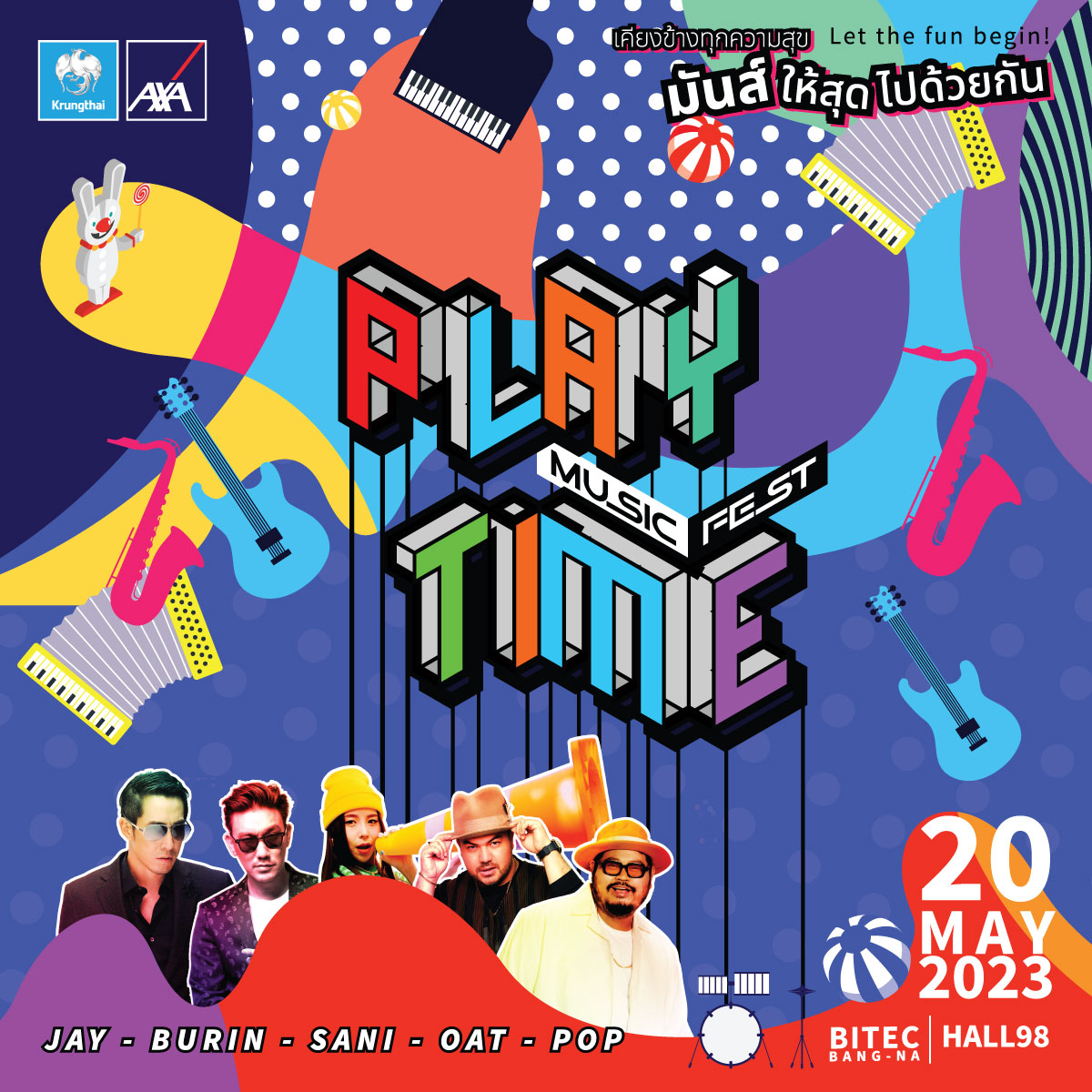21 เมษายน 2566 : บมจ.กรุงไทย-แอกซ่า ประกันชีวิต ขอมอบของขวัญสุดพิเศษให้แก่ลูกค้าคนสำคัญ จัดงานคอนเสิร์ต “KTAXA Play Time Music Festival Let the fun begin เคียงข้างทุกความสุข มันส์ให้สุดไปด้วยกัน” เพื่อเป็นการตอบแทนลูกค้าคนสำคัญที่ให้การสนับสนุน กรุงไทย-แอกซ่า ประกันชีวิต เป็นอย่างดีมาโดยตลอด ซึ่งได้รับกระแสตอบรับอย่างดีเยี่ยมจากลูกค้ามากมาย โดยมีลูกค้าลงทะเบียนสำรองที่นั่งจำนวน 8,000 ที่นั่งภายในเวลา 24 ชั่วโมง