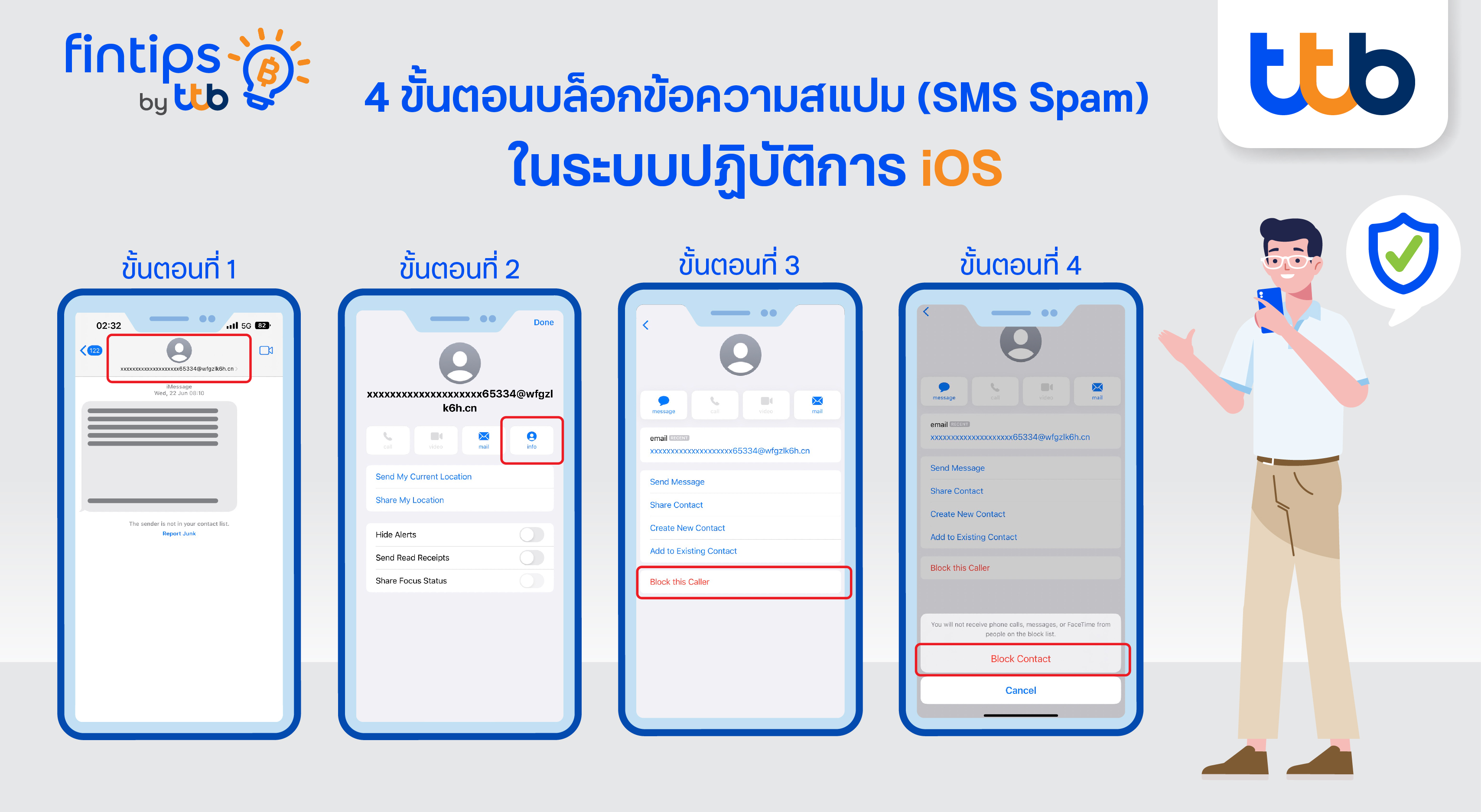 รู้เท่าทันภัย ไม่ตกเป็นเหยื่อมิจฉาชีพ! อ่านบทความเต็มได้ที่ https://www.ttbbank.com/th/fintips-blockspam หรือค้นหาเคล็ดลับการเงินอื่นได้ที่เว็บไซต์ทีทีบี