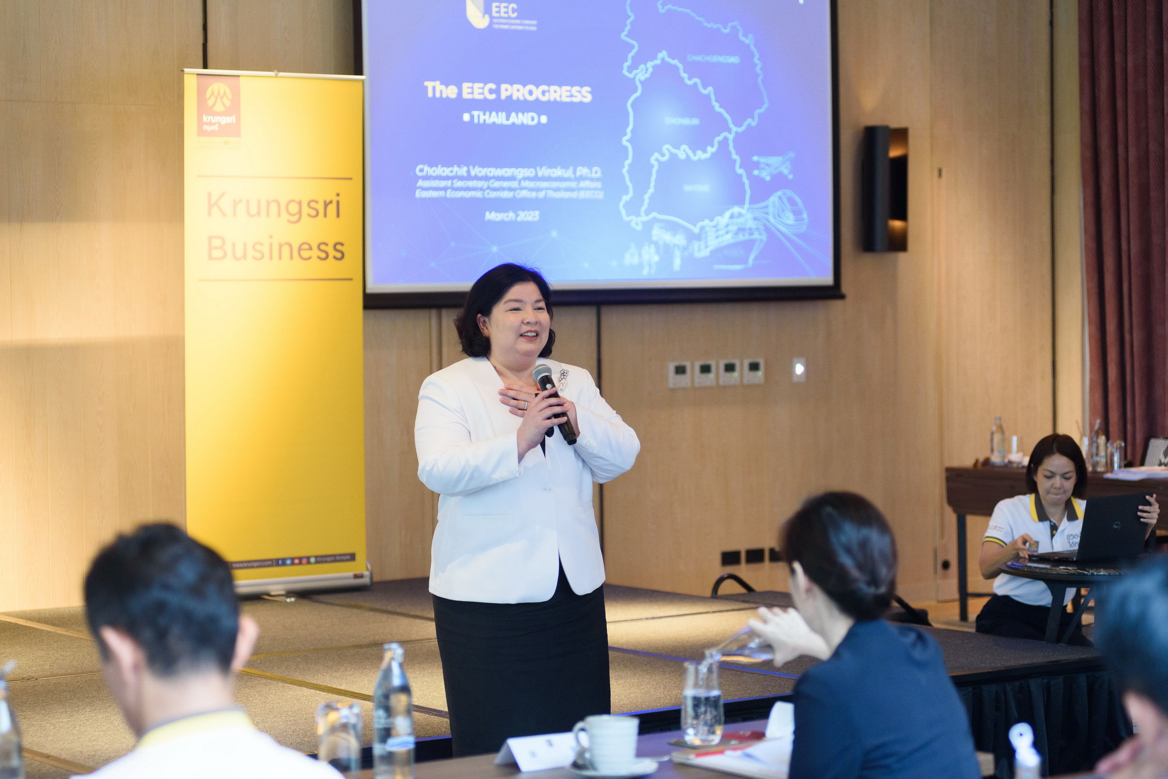 ด้าน ดร.ชลจิต วรวังโส วีรกุล ผู้ช่วยเลขาธิการด้านเศรษฐกิจมหภาค สำนักงานคณะกรรมการนโยบายเขตพัฒนาพิเศษภาคตะวันออก เปิดเผยถึงความสำเร็จและความก้าวหน้าในโครงการศูนย์ธุรกิจ EEC และเมืองใหม่น่าอยู่อัจฉริยะว่า การลงทุนในโครงการ EEC ระยะแรก รวมมูลค่าการลงทุนกว่า 1.7 ล้านล้านบาท เน้นการพัฒนาในโครงสร้างพื้นฐานที่จำเป็น โดยได้ผลักดันให้เกิดการร่วมทุนสำเร็จครบทั้ง 4 โครงการแล้ว ได้แก่ รถไฟความเร็วสูงเชื่อม 3 สนามบิน สนามบินอู่ตะเภาและเมืองการบินภาคตะวันออก ท่าเรือแหลมฉบังและท่าเรือมาบตาพุด ระยะที่ 3 โดยปัจจุบันทั้ง 4 โครงการกำลังเข้าสู่ขั้นตอนการก่อสร้างและคาดว่าจะแล้วเสร็จในปี 2568-2569 และจากนี้จะเริ่มดำเนินการเพื่อขับเคลื่อนแผนลงทุนระยะที่ 2 ภายใต้ EEC Vision 2570