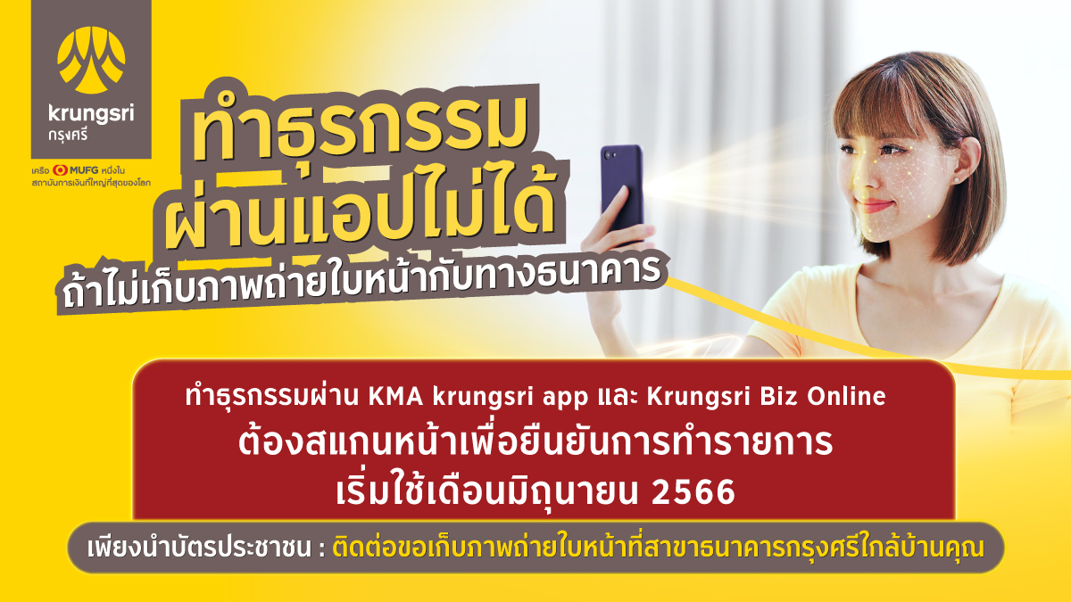 สำหรับลูกค้าที่ยังไม่เคยมีรูปถ่ายกับทางธนาคาร สามารถนำบัตรประชาชนไปยังสาขาธนาคารใกล้บ้านเพื่อถ่ายรูปเก็บใบหน้าได้ตั้งแต่วันนี้ โดยการสแกนใบหน้าจะช่วยให้ลูกค้าสามารถยืนยันตัวตนได้อย่างสะดวก รวดเร็ว และปลอดภัยมากขึ้นในการทำธุรกรรมผ่านโมบายแอปของธนาคาร นอกจากนี้ ผู้ใช้งาน KMA krungsri app ยังสามารถใช้การสแกนใบหน้าเพื่อยืนยันตัวตนสำหรับกรณีเปลี่ยนอุปกรณ์ลงแอปใหม่ ลืมรหัส เปลี่ยนเบอร์มือถือ เปิดบัญชีใหม่ หรือสมัครสินเชื่อ เพื่อความสะดวกสบายตลอดทุกการใช้งานบนแอปของธนาคารอีกด้วย ![]()