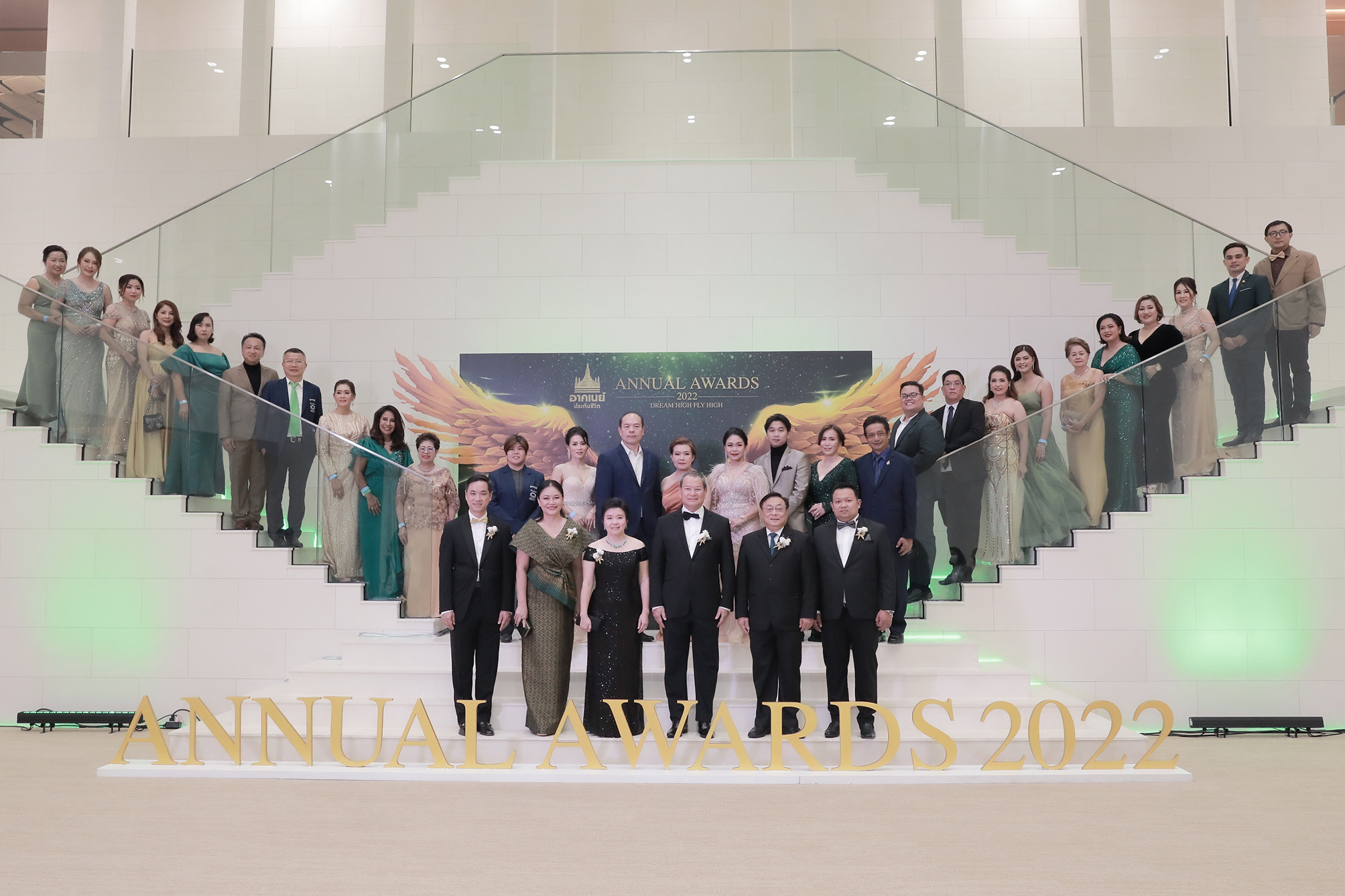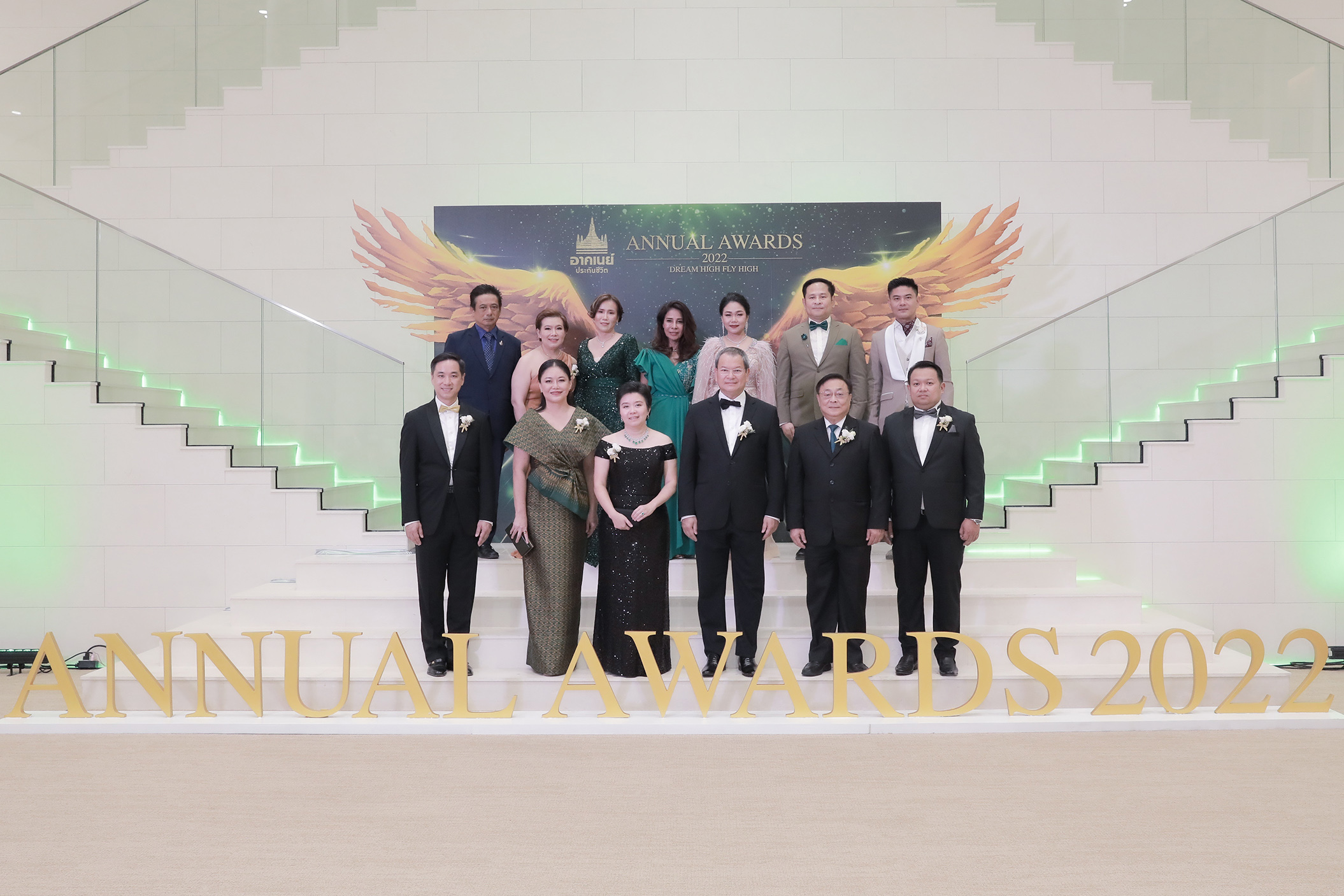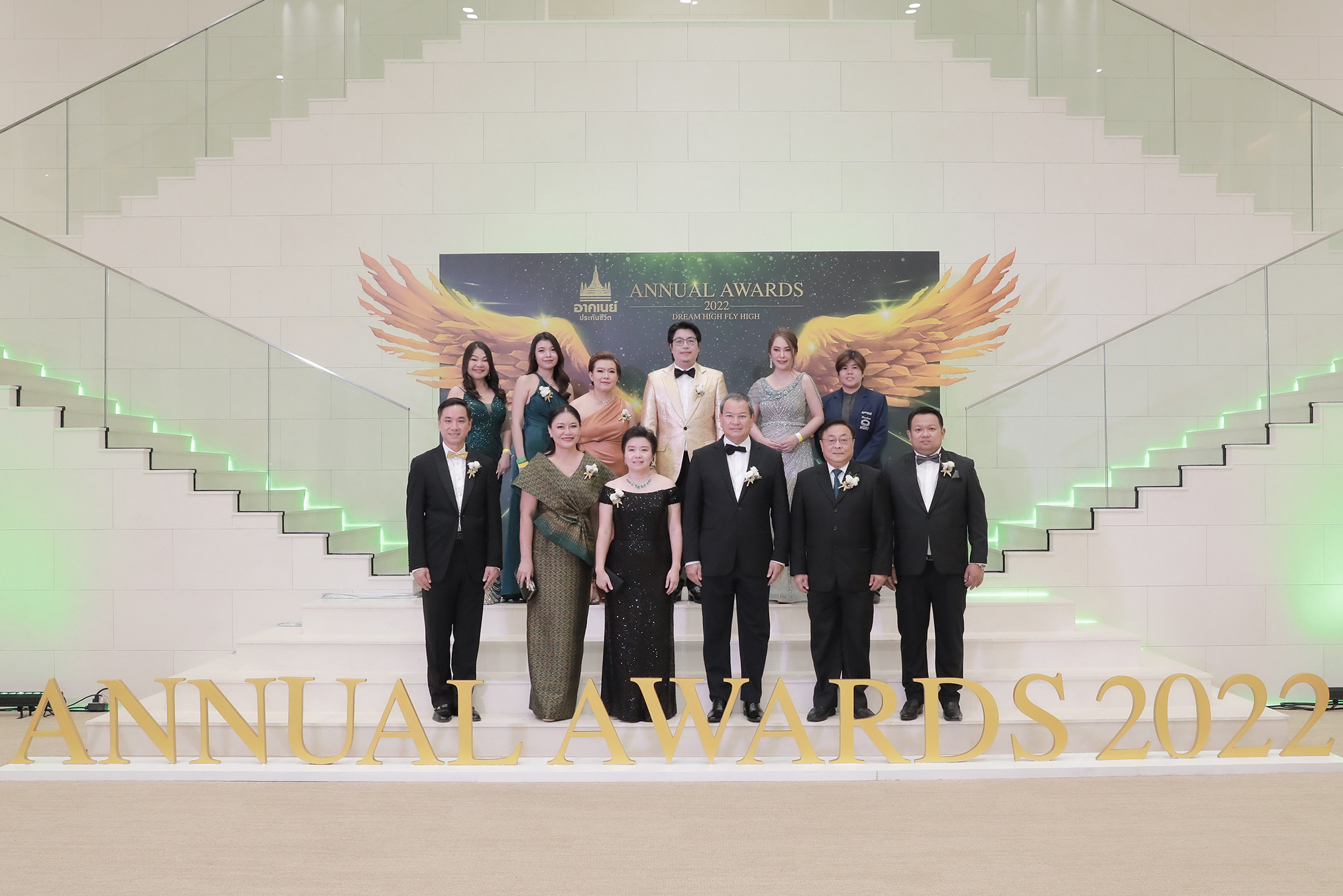 9 พฤษภาคม 2566 : โชติพัฒน์ พีชานนท์ ประธานกรรมการบริหาร (แถวหน้า – กลางขวา) อาทินันท์ พีชานนท์ รองประธานกรรมการบริหาร (แถวหน้า – กลางซ้าย) ดร.อภิชัย บุญธีรวร กรรมการ บริษัท ไทยกรุ๊ป โฮลดิ้งส์ จำกัด (มหาชน) (แถวหน้า – ที่ 2 จากขวา) และ ภฤตยา สัจจศิลา กรรมการผู้จัดการ บริษัท อาคเนย์ประกันชีวิต จำกัด (มหาชน) (แถวหน้า – ที่ 2 จากซ้าย) จัดงาน Annual Awards 2022 ภายใต้คอนเซ็ปต์ “Dream High Fly High” ร่วมฉลองความสำเร็จ พร้อมมอบรางวัลเกียรติยศแห่งความภาคภูมิใจให้แก่สุดยอดผู้บริหารและตัวแทนผู้พิชิตคุณวุฒิที่ทำยอดขายสูงสุดประจำปี 2565 ณ ศูนย์การประชุมแห่งชาติสิริกิติ์ ห้อง Plenary Hall 1 เมื่อ เร็วๆ นี้