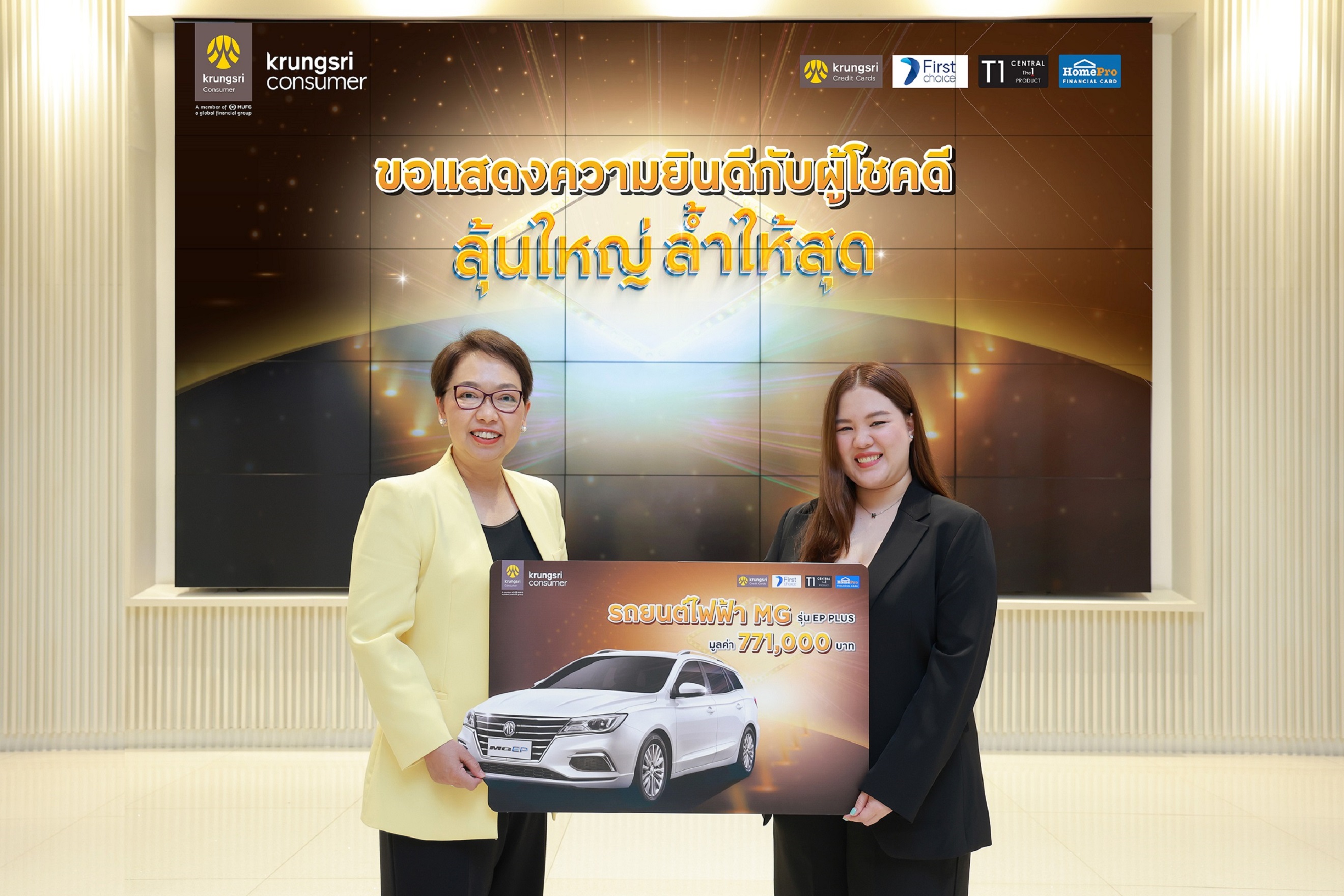 24 พฤษภาคม 2566 : ณญาณี เผือกขำ (ซ้าย) ประธานกรรมการ กรุงศรี คอนซูมเมอร์ มอบรางวัลรถยนต์ไฟฟ้า MG มูลค่ากว่า 771,000 บาท แก่ วิพาณี เสือสกุล (ขวา) ลูกค้าผู้โชคดี จากแคมเปญ ‘ลุ้นใหญ่ ล้ำให้สุด กับกรุงศรี คอนซูมเมอร์’ ซึ่งจัดขึ้นเมื่อช่วงปลายปีที่ผ่านมา เพื่อคืนกำไรให้กับลูกค้าที่สมัครบัตรเครดิตและสินเชื่อในเครือกรุงศรี คอนซูมเมอร์ และมียอดใช้จ่ายตามเงื่อนไข โดยมอบสิทธิ์ลุ้นของรางวัลมากมายรวมมูลค่ากว่า 2 ล้านบาท ![]()