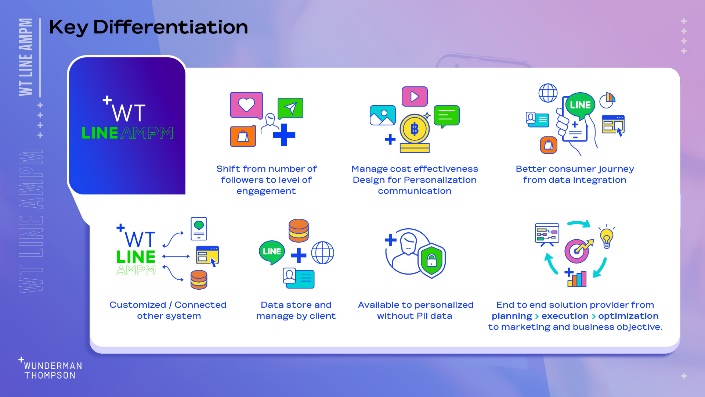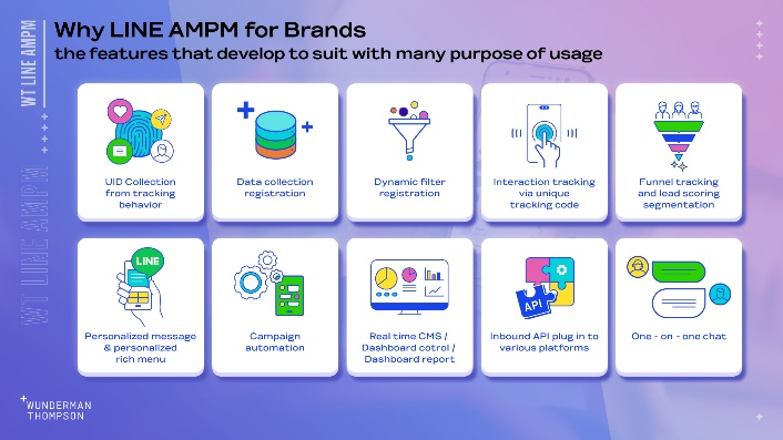 วันเดอร์แมน ธอมสัน ประเทศไทย ในฐานะเอเยนซีที่มีขีดความสามารถอันแข็งแกร่งทั้งในด้านความคิดสร้างสรรค์ ข้อมูล และเทคโนโลยี จึงสร้างสรรค์นวัตกรรมที่จะช่วยแบรนด์และนักการตลาดจัดการกับปัญหาเหล่านี้ โดยได้ออกแบบและพัฒนา LINE AMPM ให้เป็นเครื่องมือการตลาดอัตโนมัติในแบบเฉพาะบุคคลและเป็นโซลูชั่นที่ครบถ้วน เพื่อการบริหารจัดการประสบการณ์และความสัมพันธ์กับลูกค้า LINE AMPM สื่อสารแบบเรียลไทม์ในแบบที่โดนใจคนไทย
