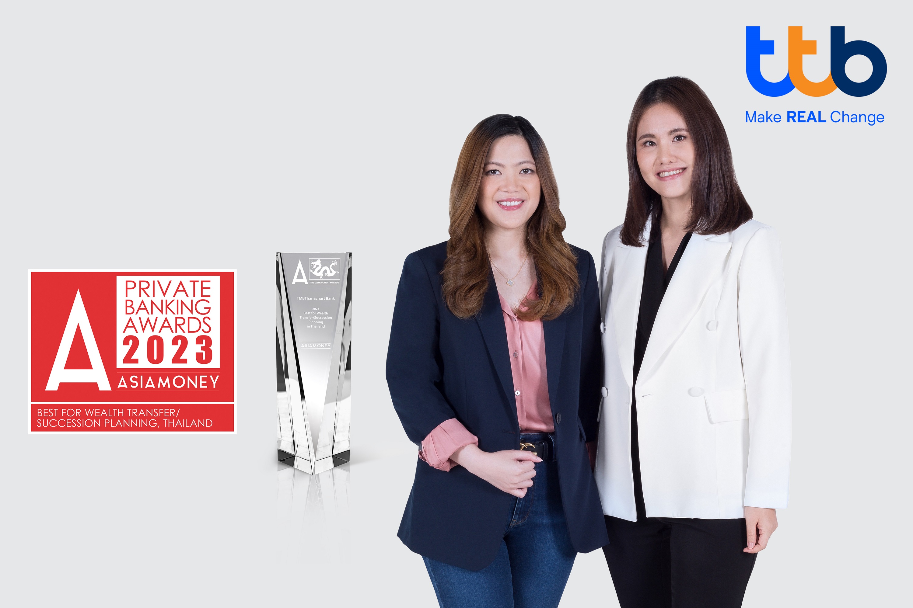 25 พฤษภาคม 2566 : ทีเอ็มบีธนชาต หรือ ทีทีบี โดย นันทพร ตั้งเจริญศิริ (ซ้าย) รองประธานเจ้าหน้าที่บริหาร หัวหน้าบริหารความสัมพันธ์และประสบการณ์ลูกค้าบุคคล พร้อมด้วย ณัฐวรรณ อภิรัตนพิมลชัย (ขวา) รองประธานเจ้าหน้าที่บริหาร หัวหน้ากลยุทธ์ลูกค้าบุคคลและประสบการณ์ลูกค้าช่องทางรวม ร่วมรับรางวัล “The Best for Wealth Transfer / Succession Planning in Thailand” จาก The Asiamoney Private Banking Awards 2023 ตอกย้ำแบรนด์ที่ส่งต่อความสำเร็จจากรุ่นสู่รุ่นได้อย่างไม่มีที่สิ้นสุด จากการนำเสนอบัตรเครดิต ttb reserve (ทีทีบี รีเซิร์ฟ) และ โซลูชันทางการเงินที่ช่วยต่อยอดความมั่งคั่งแบบครบวงจรเพื่อยกระดับชีวิตทางการเงินของลูกค้าให้ดีขึ้นในทุกมิติ ![]()