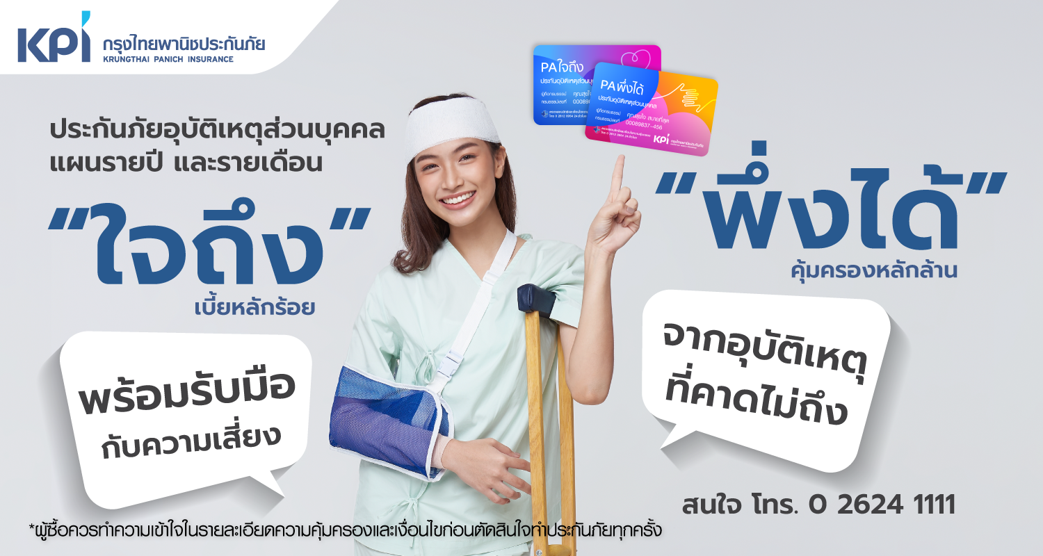 เคพีไอ หรือกรุงไทยพานิชประกันภัย เสนอแผนประกันอุบัติเหตุส่วนบุคคล “ใจถึง” “พึ่งได้” เพื่อเป็นทางเลือกให้กับผู้ที่ต้องการความคุ้มครองด้านอุบัติเหตุ ด้วยแผนประกันภัย แบบรายเดือน และรายปี ด้วยค่าเบี้ยประกันภัยราคาหลักร้อยที่ทุกคนสามารถจับต้องได้ แต่ให้ความคุ้มครองสูงถึงหลักล้าน ไม่ว่าจะดูแล ค่ารักษาพยาบาลหรือค่าชดเชยกรณีเข้าพักรักษาตัวในโรงพยาบาล และความคุ้มครองอื่นที่ครอบคลุม