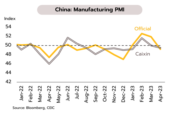 เศรษฐกิจจีน มีสัญญาณการฟื้นในรูปแบบตัว K (K-Shaped Recovery) ซึ่งเป็นลักษณะการฟื้นตัวที่แตกต่างกัน 2 กลุ่ม กลุ่มแรกฟื้นตัวกลับมาได้เร็ว เช่น การบริโภค การท่องเที่ยว และกิจกรรมในภาคบริการ ส่วนกลุ่มที่ 2 การฟื้นตัวช้าหรือยังคงอ่อนแอ สะท้อนจากดัชนี PMI ภาคอุตสาหกรรมที่เข้าสู่แดนหดตัวในเดือนเมษายน กำไรภาคอุตสาหกรรมร่วงลงติดต่อกัน 4 เดือน การลงทุนในสินทรัพย์ถาวรชะลอลง และการลงทุนภาคอสังหาริมทรัพย์หดตัวต่อเนื่อง รวมทั้งภาคส่งออกที่เติบโตชะลอลง ล่าสุดยังมีประเด็นความขัดแย้งระหว่างจีนและสหรัฐ ซึ่งอาจส่งผลต่อห่วงโซ่อุปทานด้านเทคโนโลยีของจีนและโลกในระยะต่อไป