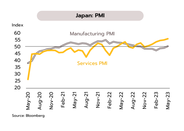 ผลบวกจากการเปิดประเทศช่วยกระตุ้นการฟื้นตัวของภาคท่องเที่ยวและการบริโภคต่อเนื่อง และอาจเป็นปัจจัยที่ทำให้ BOJ ยุติมาตรการ YCC ในช่วงครึ่งปีหลัง ในเดือนมีนาคม ยอดสั่งซื้อเครื่องจักรพื้นฐานของญี่ปุ่นลดลง 3.5% YoY และลดลง 3.9% MoM ปรับตัวลงติดต่อกันเป็นเดือนที่ 2 ขณะที่ดัชนี PMI เบื้องต้น (Flash) ในเดือนพฤษภาคมออกมาดีกว่าคาดโดยภาคการผลิตขยายตัวเป็นครั้งแรกในรอบ 7 เดือนอยู่ที่ 50.8 ส่วน PMI ภาคบริการขยายตัวแตะระดับสูงสุดเป็นประวัติการณ์ที่ 56.3 ในส่วนของอัตราเงินเฟ้อทั่วไปและพื้นฐานในโตเกียวชะลอลงสู่ 3.2% YoY ต่ำสุดในรอบ 8 เดือน