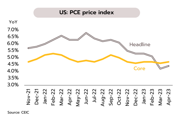 บรรลุข้อตกลงเพดานหนี้สหรัฐเบื้องต้นแล้ว ขณะที่ความไม่แน่นอนเกี่ยวกับการปรับขึ้นดอกเบี้ยของเฟดยังเป็นที่น่ากังวล ในเดือนพฤษภาคมดัชนีความเชื่อมั่นผู้บริโภคของสหรัฐ ปรับตัวลงสู่ 59.2 ซึ่งเป็นระดับต่ำสุดในรอบ 6 เดือน ขณะที่ในเดือนเมษายน ดัชนี PCE ทั่วไปเพิ่มขึ้น 4.4% YoY ส่วนดัชนี PCE พื้นฐานเพิ่มขึ้น 4.7% YoY