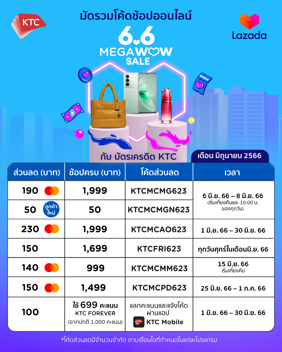 “แคมเปญที่ 2 Lazada 6.6 Mega Wow Sale ระหว่างวันที่ 6-8 มิถุนายน 2566 สิทธิพิเศษนี้เพื่อสมาชิกบัตรเครดิตเคทีซีมาสเตอร์การ์ดทุกประเภท รับส่วนลด 190 บาท เมื่อช้อปออนไลน์ผ่าน www.lazada.co.th หรือแอปฯ Lazada ตั้งแต่ 1,999 บาทขึ้นไปต่อรายการซื้อสุทธิ โดยระบุรหัสส่วนลด KTCMCMG623 ก่อนการชำระเงิน พิเศษ สมาชิกบัตรเครดิตเคทีซีมาสเตอร์การ์ดที่ช้อปออนไลน์ครั้งแรกกับ Lazada ผ่านแอปฯ Lazada รับส่วนลดทันที 50 บาท โดยระบุรหัสส่วนลด KTCMCMGN623 ก่อนชำระเงิน” ![]()