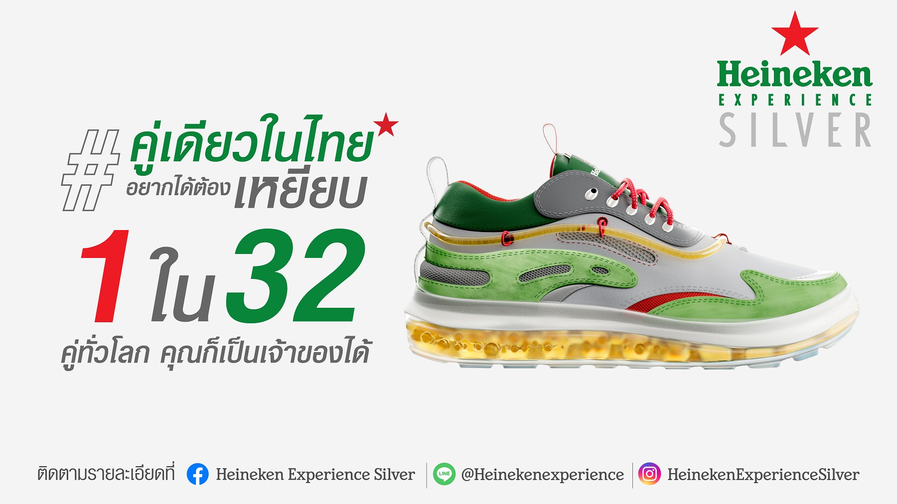 เชิญชวนให้ทุกคนมาครีเอทโมเมนต์การเหยียบวัดไซส์รองเท้ากับภาพโฆษณา “The Ads you can kick” บนสื่อ Out-Of-Home ทั่วกรุงเทพฯ รวมไปถึง Giant Shoebox ที่ตั้งอยู่ที่สามย่านมิตรทาวน์ เพื่อลุ้นเป็นเจ้าของไลฟ์สไตล์ไอเท็มชิ้นนี้แต่เพียงผู้เดียวในประเทศไทย จุดกระแสกลุ่มเป้าหมายคนรุ่นใหม่ โดยเฉพาะกลุ่มแฟชั่นนิสต้าและเหล่า Sneakerhead ให้มาร่วมแคมเปญ ลุ้นเป็นเจ้าของสนีกเกอร์ลิมิเต็ดอิดิชั่น หนึ่งในไลฟ์สไตล์ไอเท็มที่มีเพียงคู่เดียวในประเทศไทย ผ่านช่องทางโซเชียลมิเดีย Heineken Experience Silver และ LINE @heinekenexperience ![]()