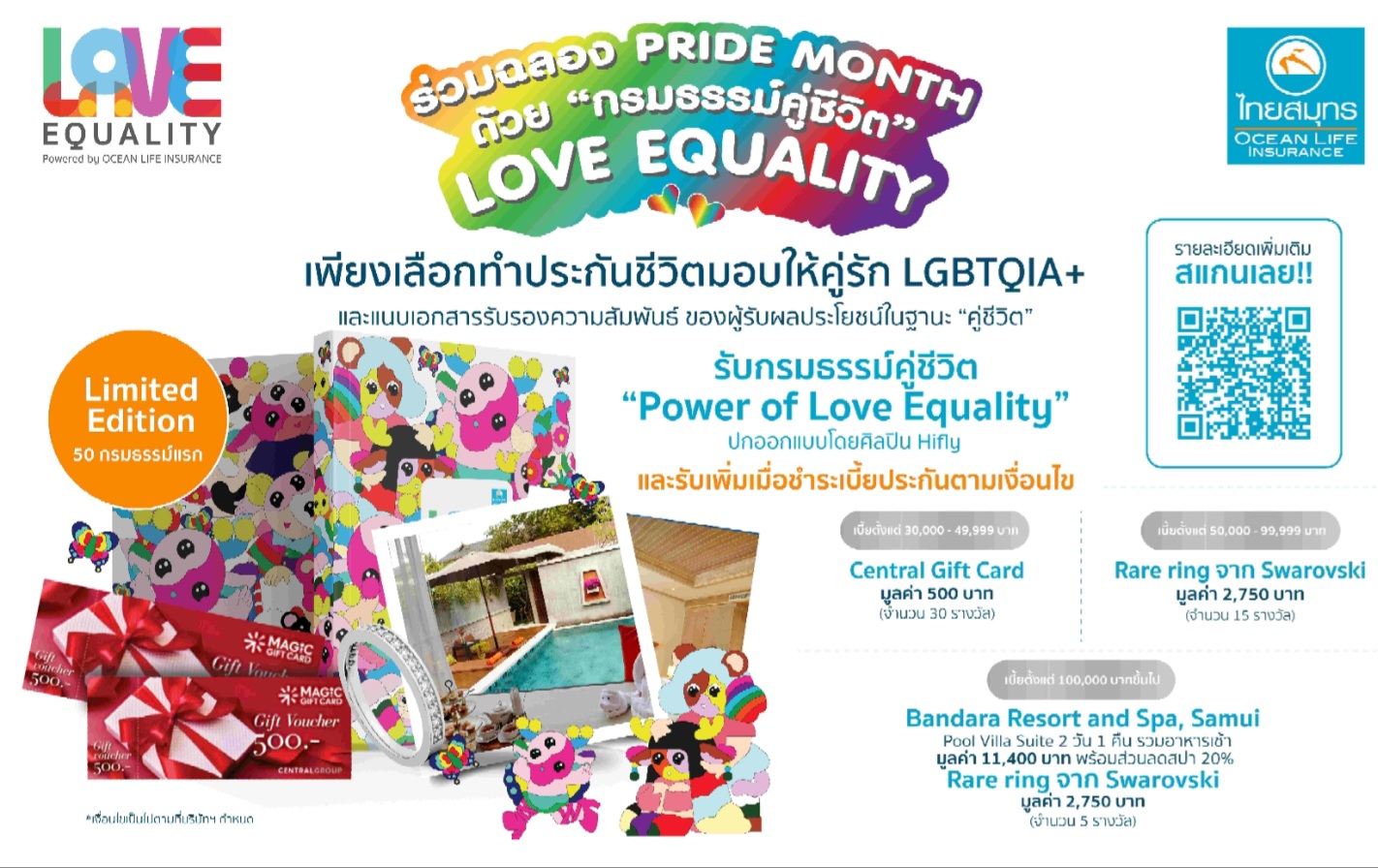 พิเศษสุด! ในช่วง Pride Month คู่รักที่ขอทำกรมธรรม์ "กรมธรรม์คู่ชีวิต" ฉบับใหม่ โดยระบุให้ “คู่ชีวิต” เป็นผู้รับประโยชน์ พร้อมลงทะเบียนร่วมกิจกรรมผ่าน Ocean Club Application ระหว่างวันที่ 1 มิถุนายน 2566 ถึงวันที่ 31 สิงหาคม 2566 และบริษัทฯ ได้พิจารณาอนุมัติรับประกันภัยภายในวันที่ 30 กันยายน 2566 สำหรับ 50 ท่านแรก รับไปเลยกรมธรรม์คู่ชีวิต LIMITED EDITION “Power of Love Equality” ออกแบบปกโดยศิลปินไฮฟราย พร้อมของสมนาคุณสุด Exclusive! ดังนี้