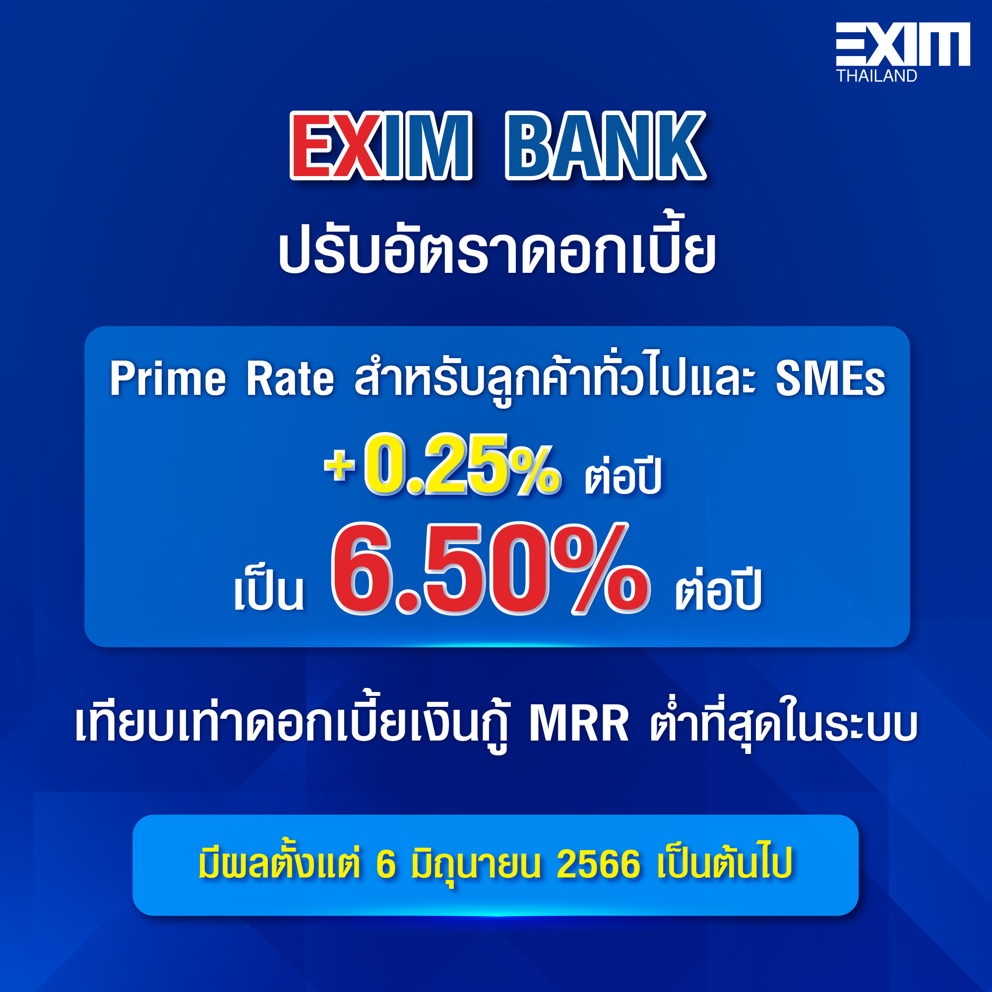 EXIM ANK จึงประกาศปรับอัตราดอกเบี้ย Prime Rate 0.25% ต่อปี จาก 6.25% ต่อปี เป็น 6.50% ต่อปี ซึ่งยังคงเป็นอัตราดอกเบี้ยเงินกู้ลูกค้ารายย่อยชั้นดีที่ต่ำที่สุดในระบบ มีผลตั้งแต่วันที่ 6 มิถุนายน 2566 เป็นต้นไป
