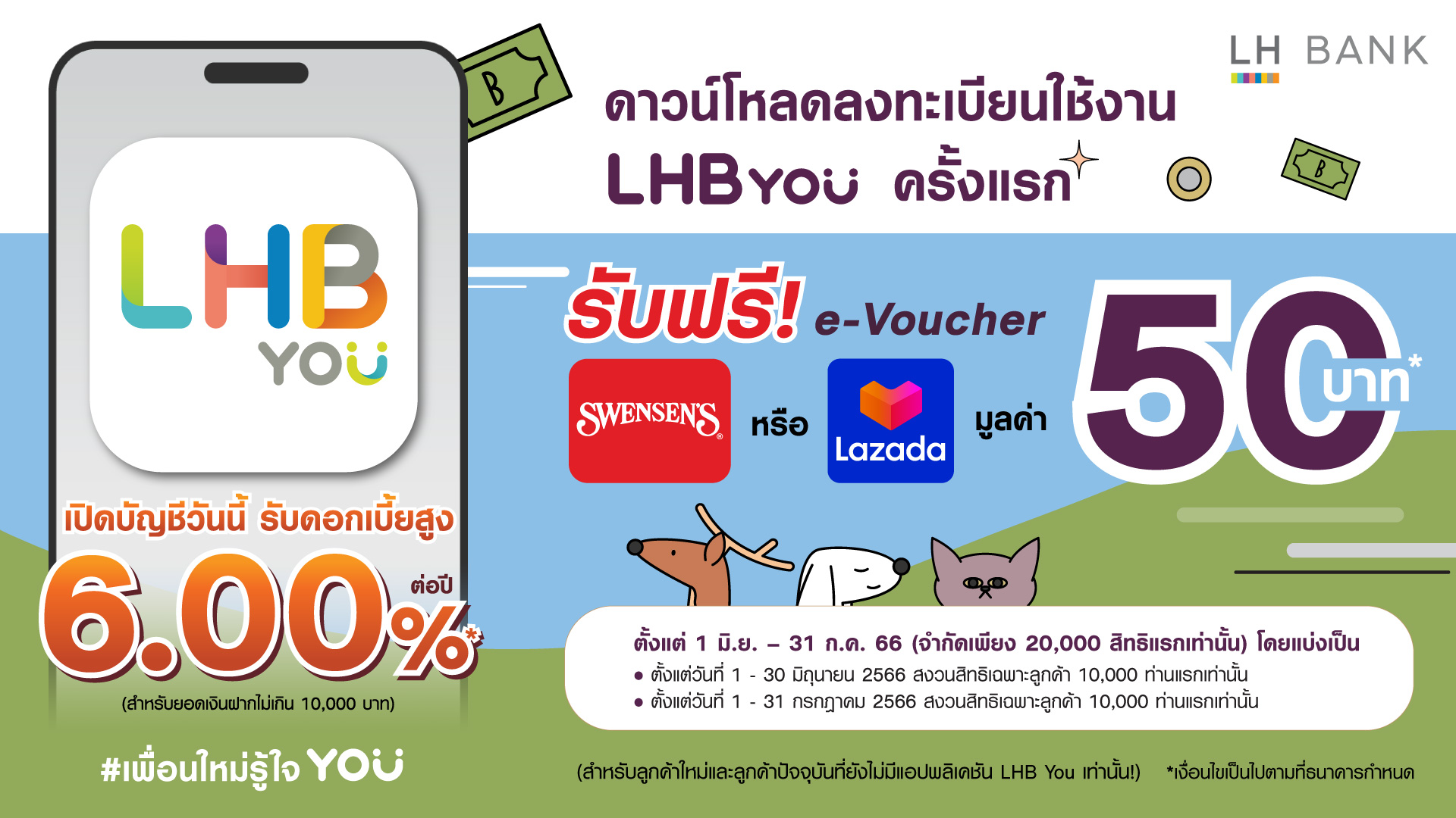 โปรโมชันพิเศษสำหรับลูกค้าใหม่ และลูกค้าปัจจุบันของธนาคารที่ยังไม่มีแอปพลิเคชัน LHB You เมื่อดาวน์โหลดและลงทะเบียนเข้าใช้งานครั้งแรกเลือกรับทันที e-Voucher LAZADA หรือ Swensen’s มูลค่า 50 บาท สงวนสิทธิ์จำนวน 20,000 สิทธิ์แรกเท่านั้น จำกัดลูกค้า 1 ท่าน ต่อ 1 สิทธิ์ โดยลูกค้าสามารถแลกรับคูปองได้ที่เมนูสิทธิพิเศษ ผ่านแอปพลิเคชัน LHB You ตั้งแต่วันที่ 1 มิ.ย. – 31 ก.ค. 66 เงื่อนไขเป็นไปตามที่ธนาคารกำหนด