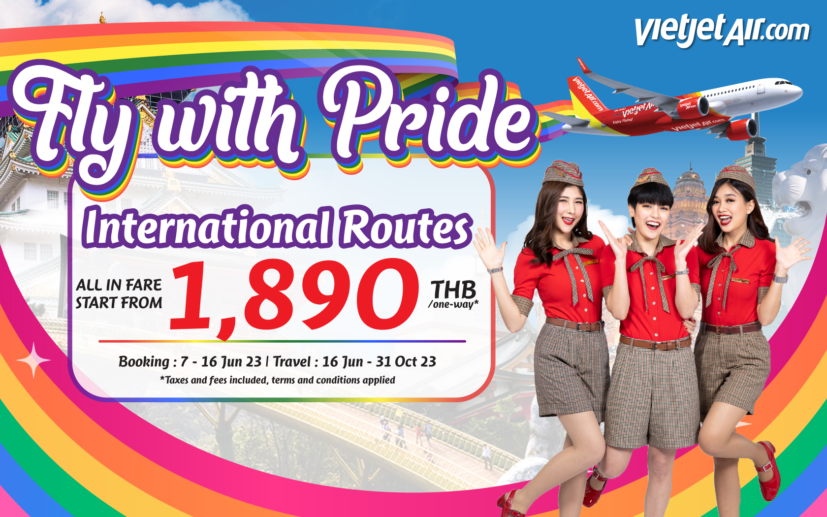 กรุงเทพฯ, 7 มิถุนายน 2566 : สายการบินไทยเวียตเจ็ทฉลองเดือนแห่งความภาคภูมิใจของกลุ่มผู้มีความหลากหลายทางเพศด้วยโปรโมชั่น “Fly with Pride” เสนอบัตรโดยสารราคาพิเศษ เริ่มต้นเพียง 1,890 บาท (ราคารวมภาษีและค่าธรรมเนียม) สำหรับเดินทางบนเครือข่ายเส้นทางบินระหว่างประเทศของไทยเวียตเจ็ท ผู้โดยสารสามารถสำรองบัตรโดยสารได้ระหว่างวันที่ 7 – 16 มิถุนายน 2566 เดินทางได้ระหว่างวันที่ 16 มิถุนายน – 31 ตุลาคม 2566 (ยกเว้นวันหยุดนักขัตฤกษ์) ที่ www.vietjetair.com