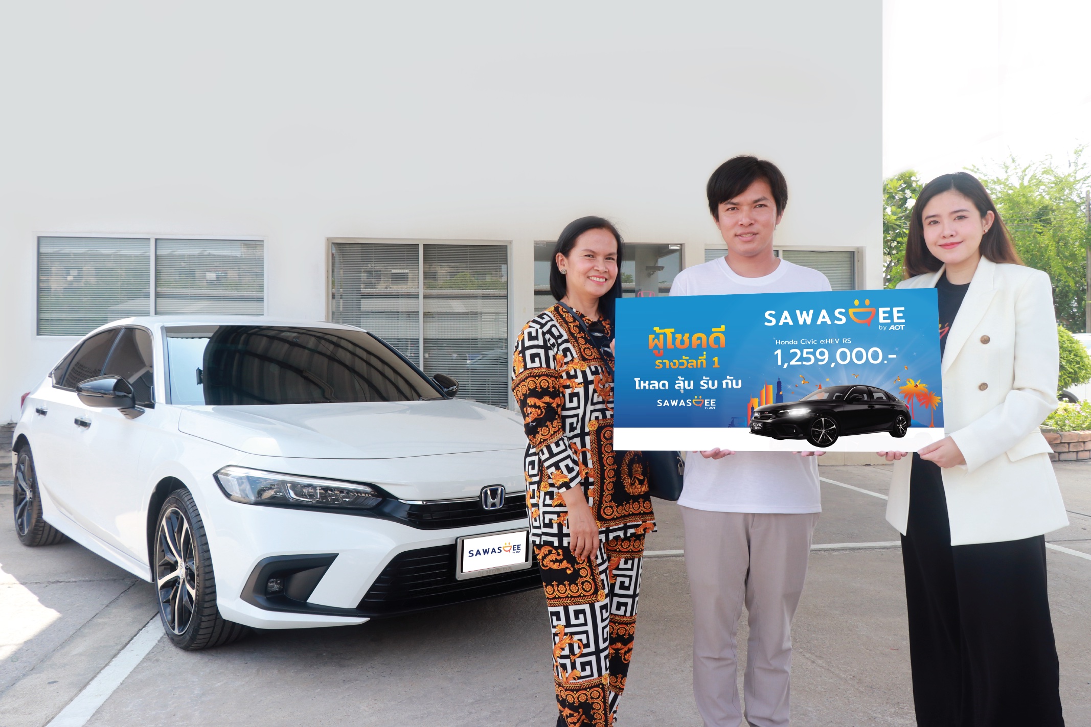 7 มิถุนายน 2566 : บริษัท สกาย ไอซีที จำกัด (มหาชน) ผู้พัฒนาแอปพลิเคชัน SAWASDEE by AOT นำโดย สาธิมา โล่ห์วัชรสันติ (ขวา) ผู้อำนวยการฝ่ายการจัดการผลิตภัณฑ์ มอบรางวัลใหญ่ รถยนต์ Honda Civic รุ่น e:HEV RS จำนวน 1 รางวัล มูลค่ากว่า 1,259,000 บาท ให้แก่ ภาณุพงษ์ กาญจนศรี ผู้โชคดีจากจังหวัดสุราษฎร์ธานี จากการดาวน์โหลด และลงทะเบียนแอปพลิเคชัน SAWASDEE by AOT ในแคมเปญ “โหลด ลุ้น รับ กับแอป SAWASDEE by AOT”