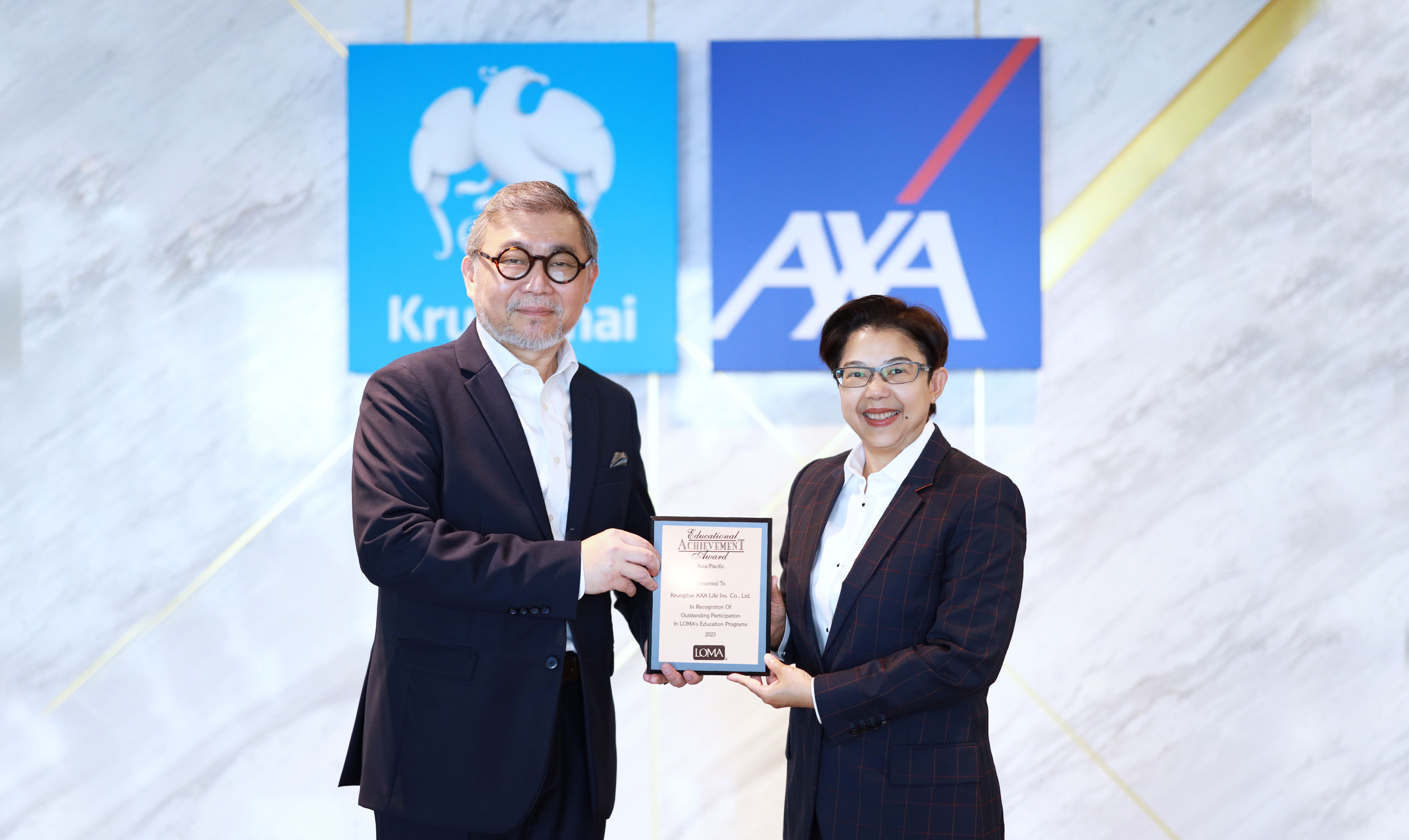 8 มิถุนายน 2566 : บมจ.กรุงไทย-แอกซ่า ประกันชีวิต โดย คุณบุปผาวดี โอวรารินท์ ประธานเจ้าหน้าที่บริหาร ฝ่ายทรัพยากรบุคคล และภาพลักษณ์องค์กรและการสื่อสารองค์กร (คนขวา) รับรางวัล 2023 Education Achievement Awards หรือ รางวัลองค์กรสนับสนุนการเรียนรู้ทางด้านธุรกิจประกันดีเด่น จากสมาคม Life Office Management Association (LOMA) ต่อเนื่องเป็นปีที่ 5 โดยได้รับเกียรติจากนายสุรพล ทองทูลทรัพย์ ผู้แทนประจำประเทศไทย ของสถาบัน LIMRA LOMA (คนซ้าย) ให้เกียรติมอบรางวัล ณ สำนักงานใหญ่ กรุงไทย-แอกซ่า ประกันชีวิต อาคาร จี ทาวเวอร์ แกรนด์ รามา 9 ถนนพระราม 9