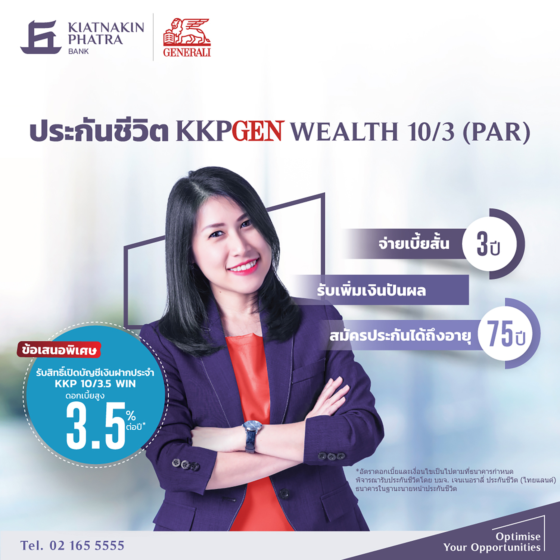 สำหรับจุดเด่นของ KKPGEN Wealth 10/3 (Par) คือ ชำระเบี้ยประกันระยะสั้นเพียง 3 ปี แต่ให้ถึง 3 ความคุ้มค่าตลอดระยะเวลา 10 ปี ได้แก่ คุ้มที่ 1 ความคุ้มครองกรณีเสียชีวิตระหว่างสัญญารับผลประโยชน์สูงสุด 315% ของจำนวนเงินเอาประกันภัย หรือกรณีอยู่จนครบสัญญารับเงินคืน 320% ของจำนวนเงินเอาประกันภัย คุ้มที่ 2 รับเงินคืนระหว่างสัญญา 2% ของจำนวนเงินเอาประกันภัย ทุก 2 ปี ณ สิ้นปีกรมธรรม์ที่กำหนด คุ้มที่ 3 โอกาสในการรับเงินปันผลทุกปี