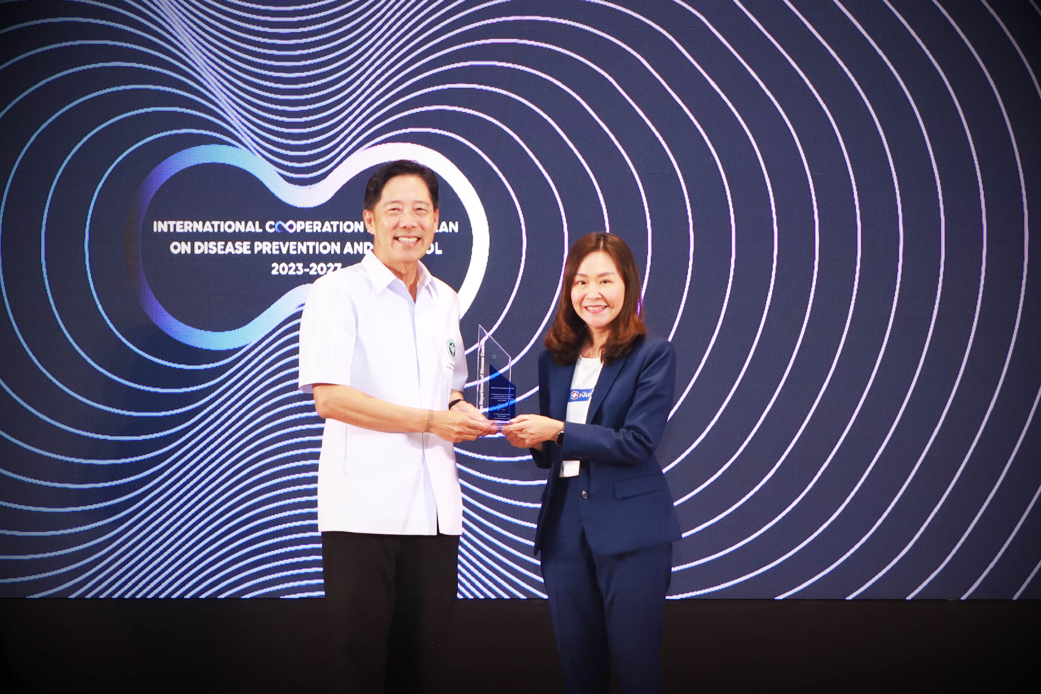 โดยได้รับเกียรติจาก นพ.ธเรศ กรัษนัยรวิวงค์ (ซ้าย) อธิบดีกรมควบคุมโรค เป็นผู้มอบรางวัลดังกล่าว ภายในงานประชุม “แผนปฏิบัติการความร่วมมือระหว่างประเทศด้านการป้องกันควบคุมโรคและภัยสุขภาพระยะที่ 2 (พ.ศ. 2566 – 2570)” จัดโดย กรมควบคุมโรค กระทรวงสาธารณสุข ณ โรงแรมรามา การ์เด้นส์ กรุงเทพมหานคร เมื่อเร็วๆ นี้ ![]()